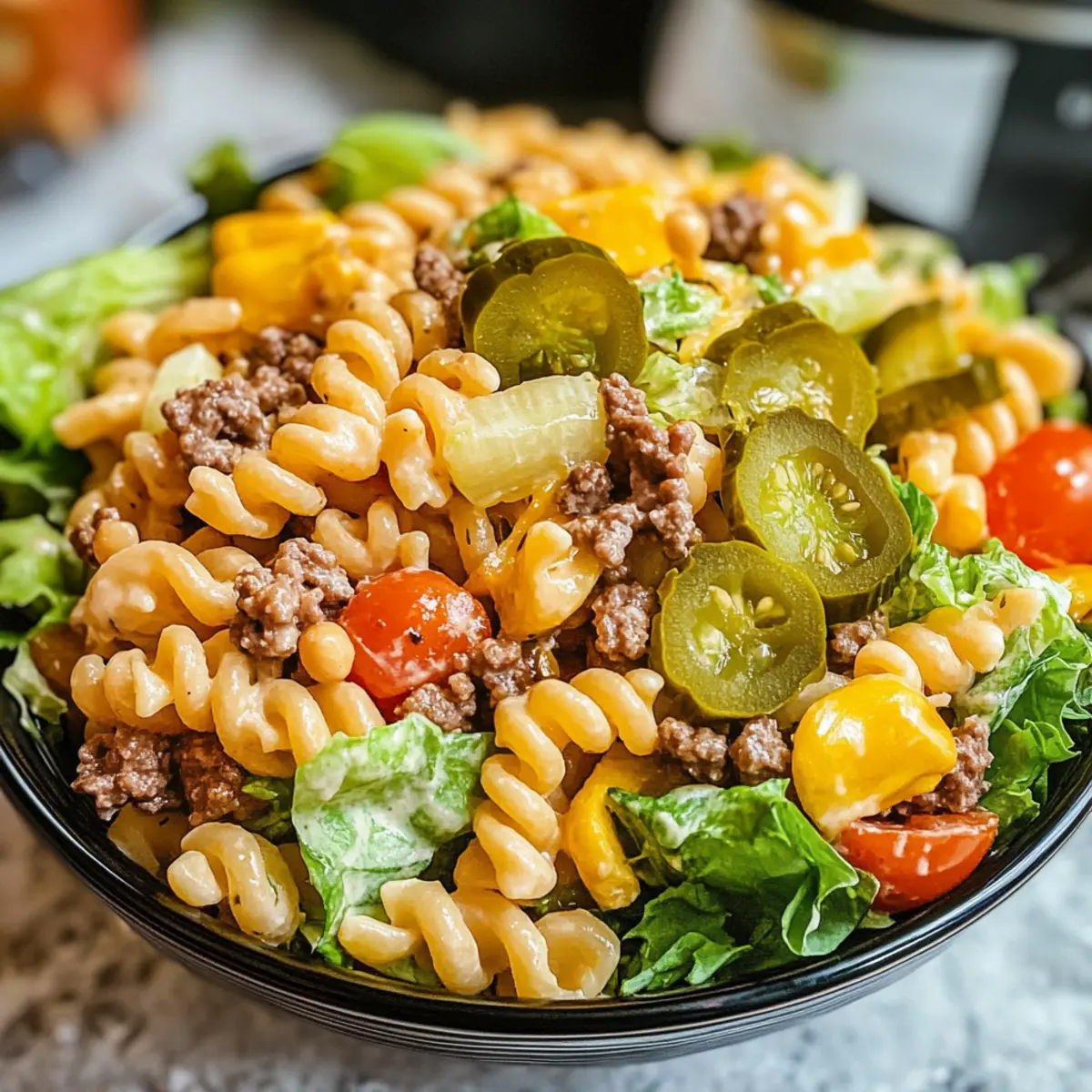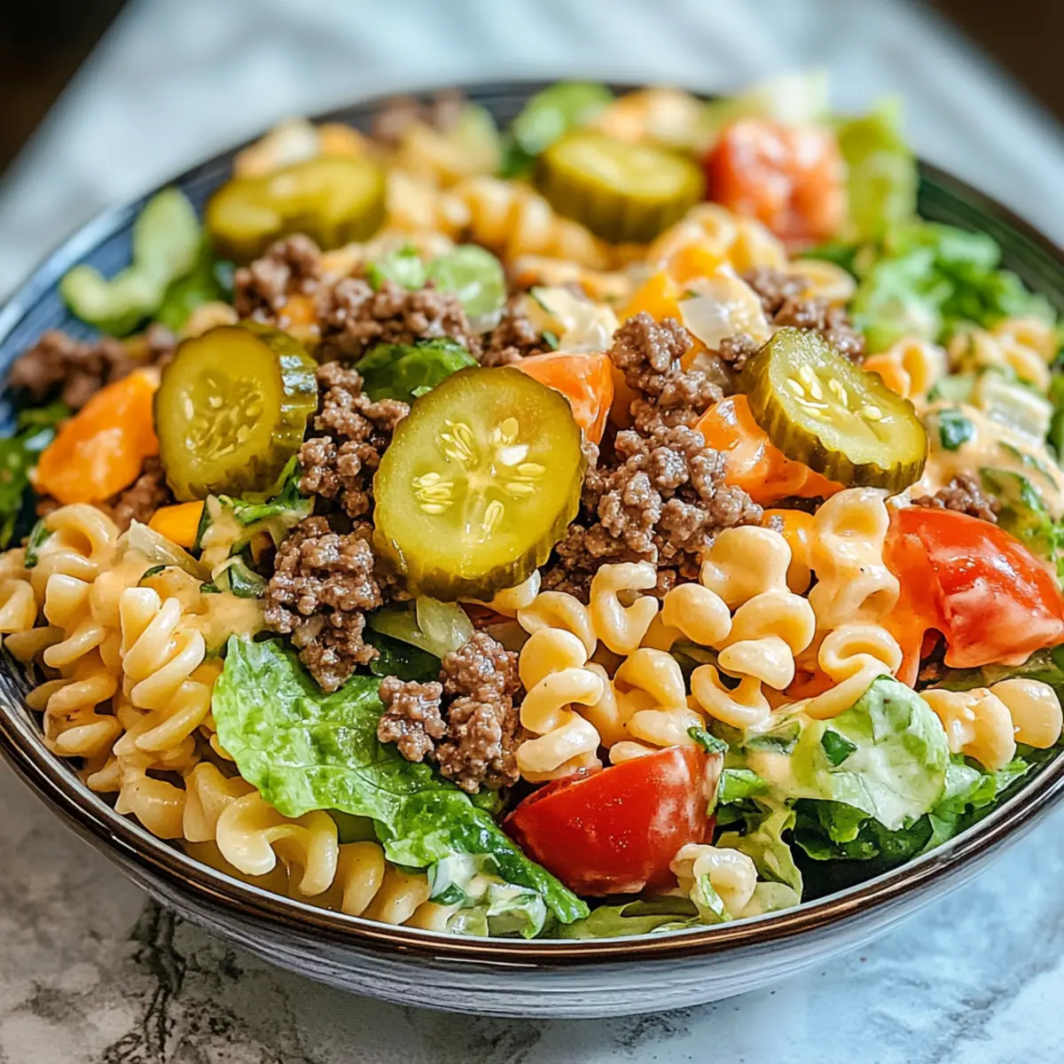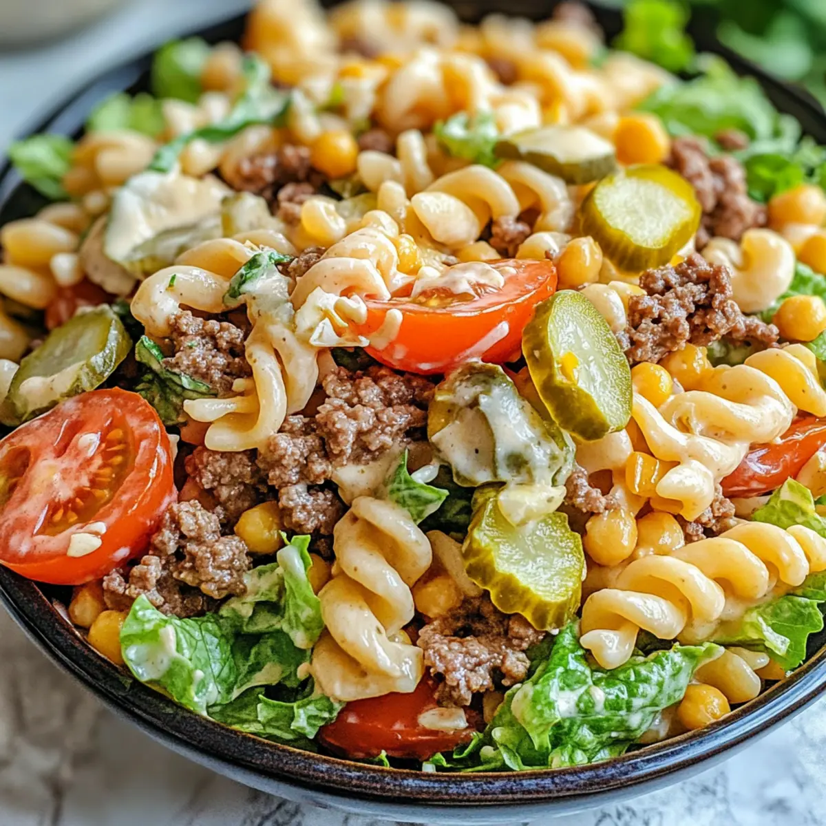 Einfachheit macht das Kochen zum Vergnügen! Dieser Big Mac Nudel Salat benötigt keine ausgefallenen Kochtechniken und ist ruck-zuck zubereitet. Herzhafter Geschmack entsteht durch die Kombination von magerem Rinderhack und frischem Gemüse, die für jeden Gaumen ansprechend ist. Vielseitigkeit ist ein weiteres Plus – verwandle ihn in eine vegetarische Variante, indem du das Fleisch durch Gemüse oder Hülsenfrüchte ersetzt. Perfekte Texturen vereinen sich in der harmonischen Kombination von knusprigem Salat und cremigem Dressing. Sei es für ein Grillfest oder ein entspanntes Abendessen, dieser Salat wird garantiert zum Star. Zeitersparnis ist ebenfalls gegeben: Bereite ihn im Voraus vor und halte die Sauce separat – das ist praktisch und sorgt für frische Aromen!