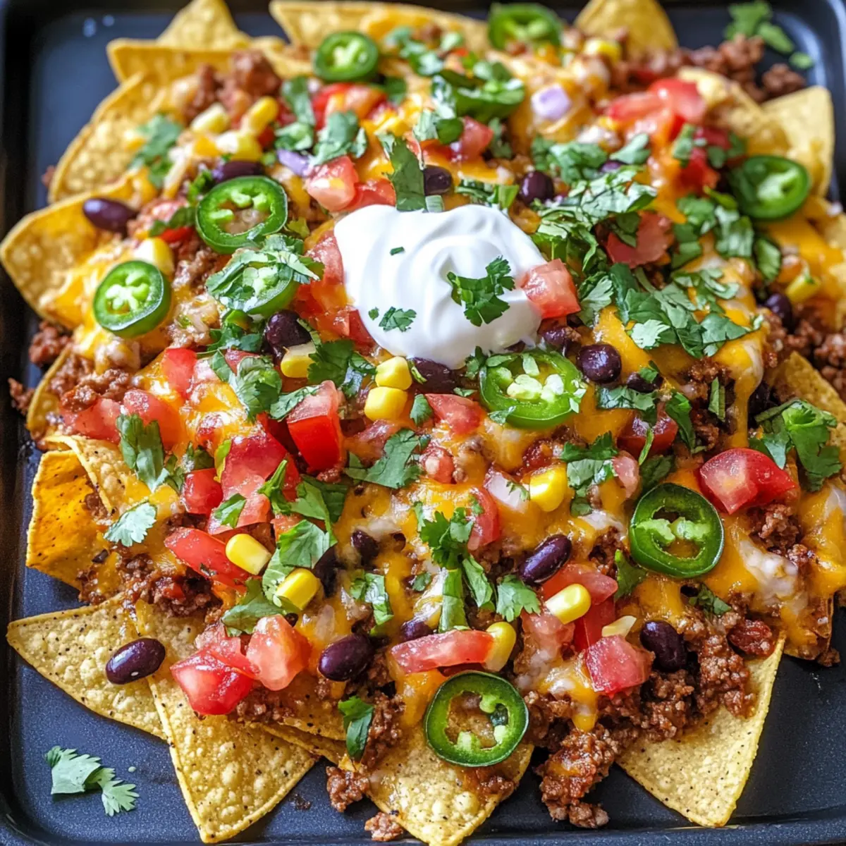 - Garnieren Sie die Nachos sofort mit gewürfelten Tomaten, Zwiebel, Jalapenos, Sauerrahm und frischem Koriander und servieren Sie sie heiß.