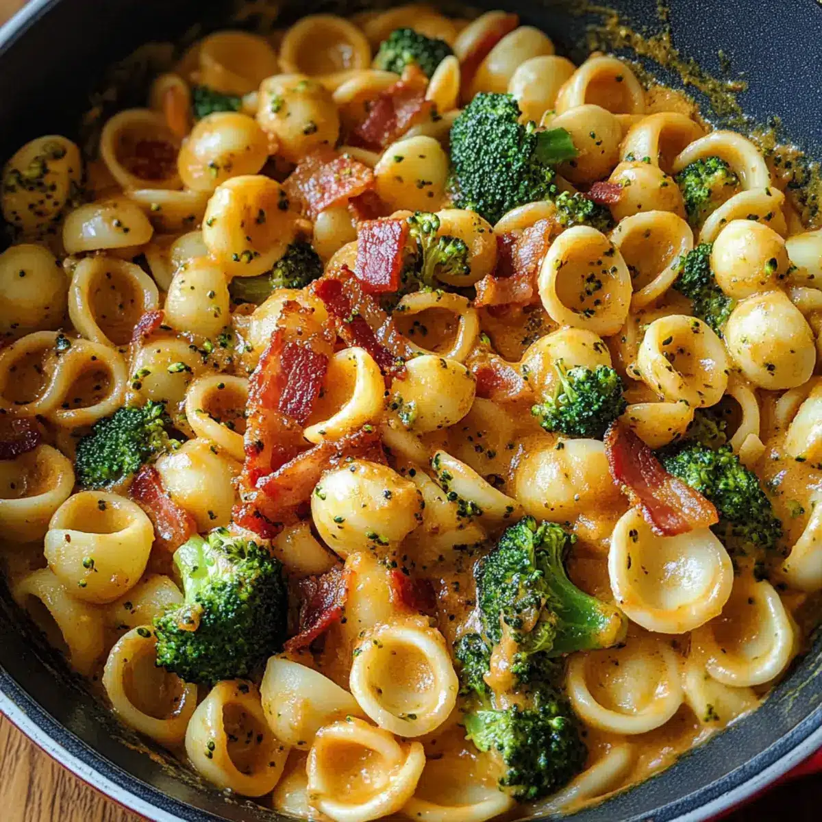 Sobald der Bacon knusprig ist, füge die gewürfelte Zwiebel und den gehackten Knoblauch in die Pfanne hinzu. Reduziere die Hitze auf mittlere Stufe und brate alles für ca. 2 Minuten, bis die Zwiebel weich und durchsichtig ist. Die Aromen vermischen sich und sorgen für eine tolle Basis für deine Brokkoli Orecchiette.