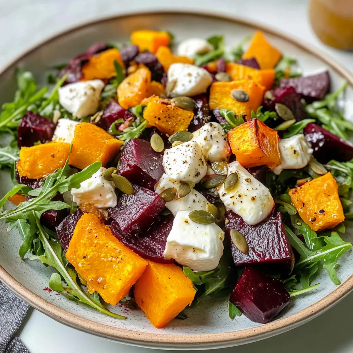 Sobald das Gemüse aus dem Ofen kommt, lasse es etwas abkühlen. In einer großen Salatschüssel kombinierst du die geröstete Butternut und Rote Bete mit frischem Rucola, cremigem Mozzarella, gehacktem Koriander und knusprigen Kürbiskernen. Achte darauf, dass alle Zutaten gleichmäßig verteilt sind, um jeden Bissen schmackhaft zu machen.