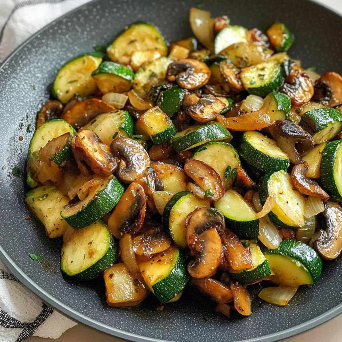 Leckere gebratene Zucchini mit Pilzen und Zwiebeln