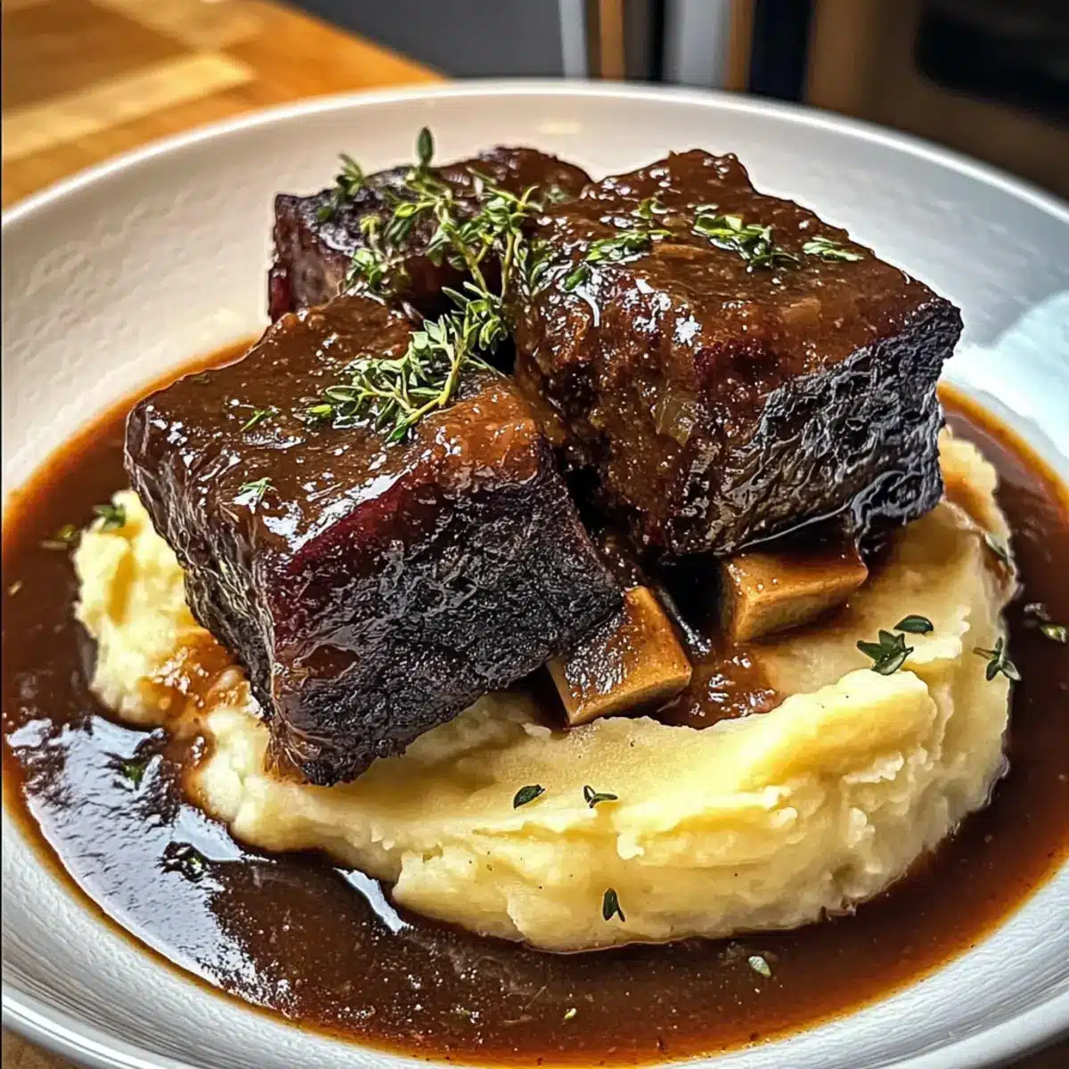 Geschmorte Rinderbruststücke mit Knoblauchpüree