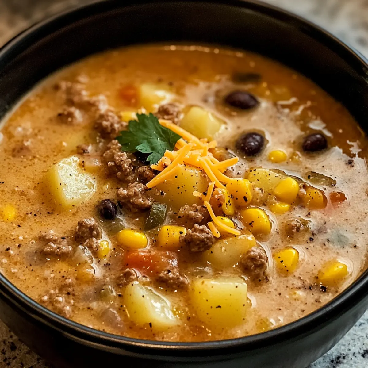 Schmecke die Cowboy Suppe mit Salz und schwarzem Pfeffer ab und lasse sie für weitere 5 Minuten köcheln. Diese letzte Geschmacksanpassung bringt alle Aromen zur Geltung und sorgt für ein ausgewogenes Ergebnis. Serviere die Suppe heiß, garniert mit geriebenem Cheddar-Käse für einen zusätzlichen Geschmackskick.
