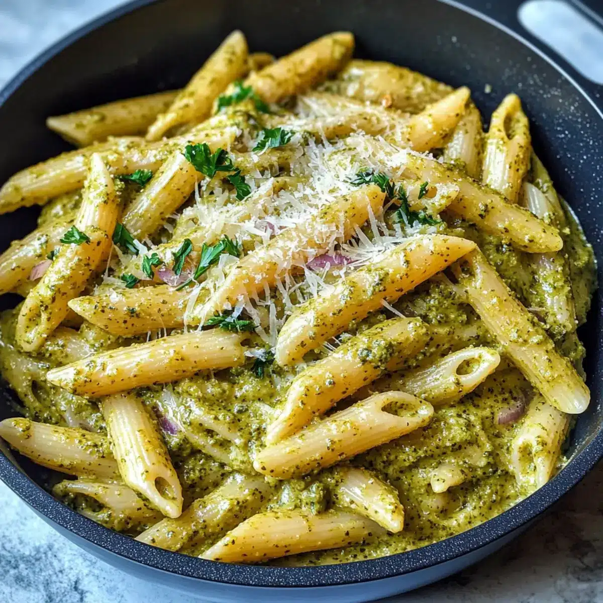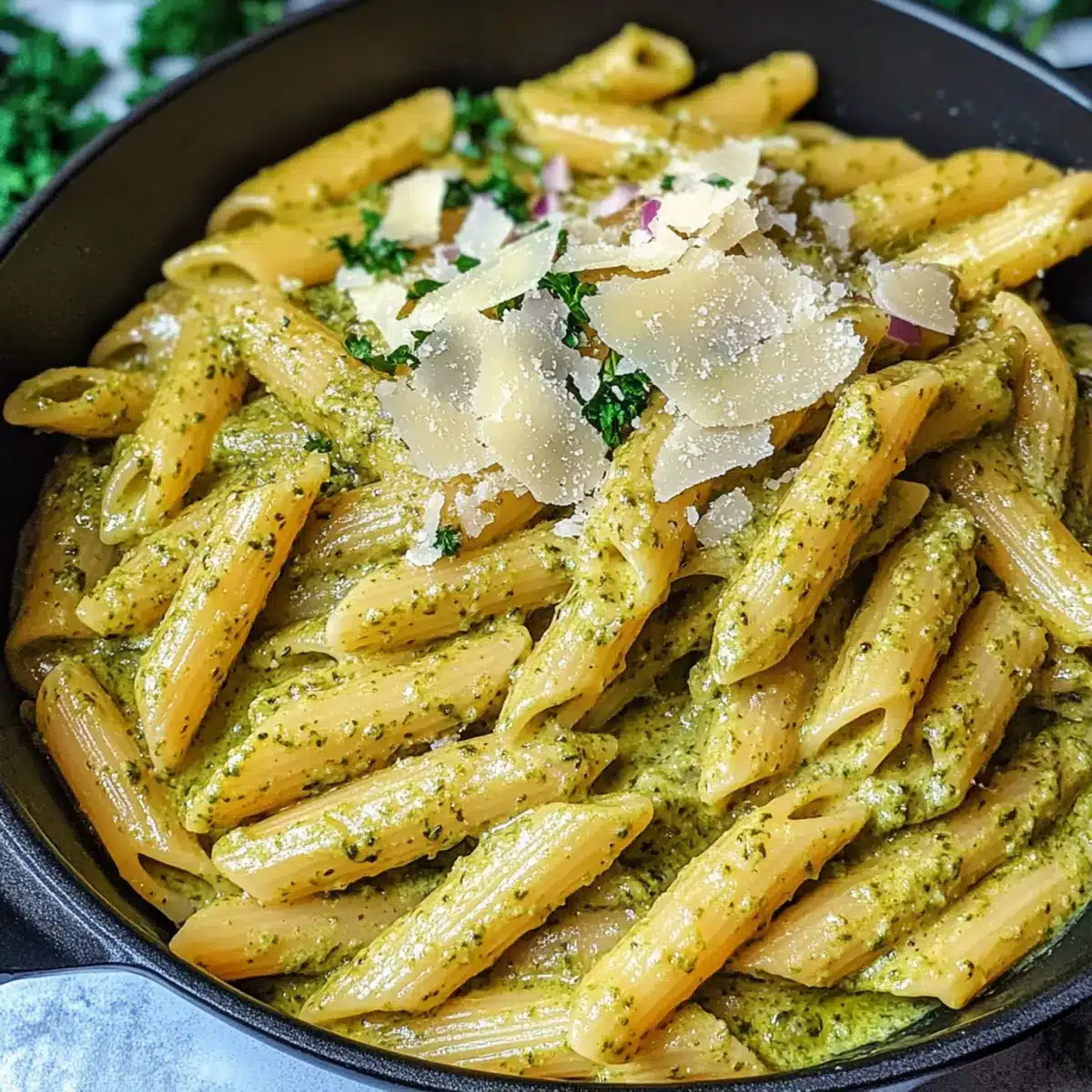 Richte die cremige Pesto Sauce Pasta auf Tellern an und garniere sie mit frisch geriebenem Parmesan und etwas Petersilie. Genieße dieses reichhaltige und köstliche Gericht warm, während die Aromen noch frisch und lebendig sind.