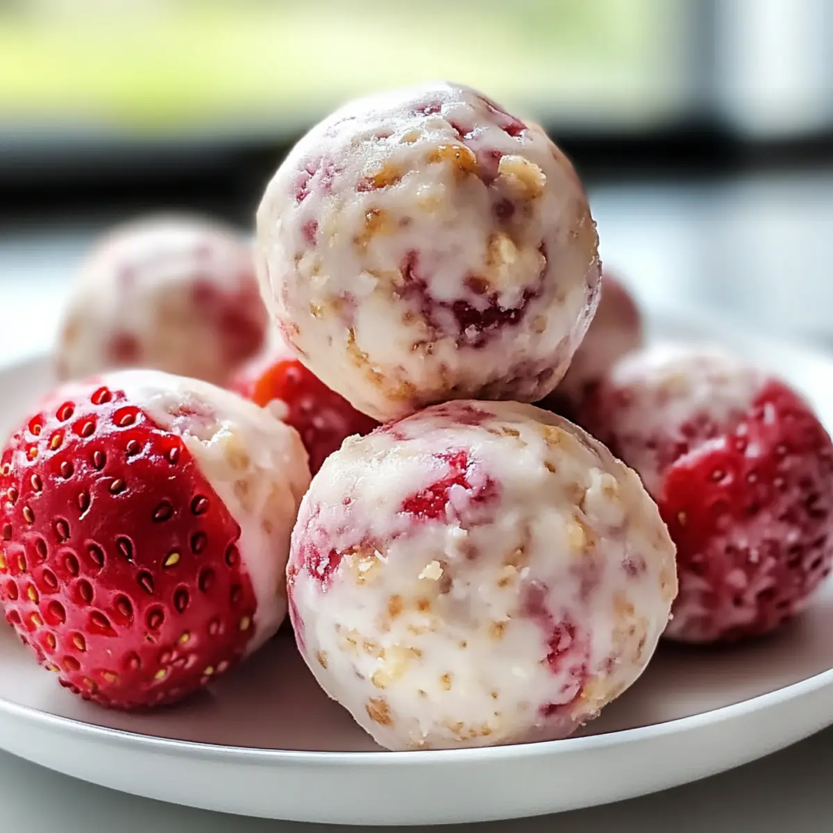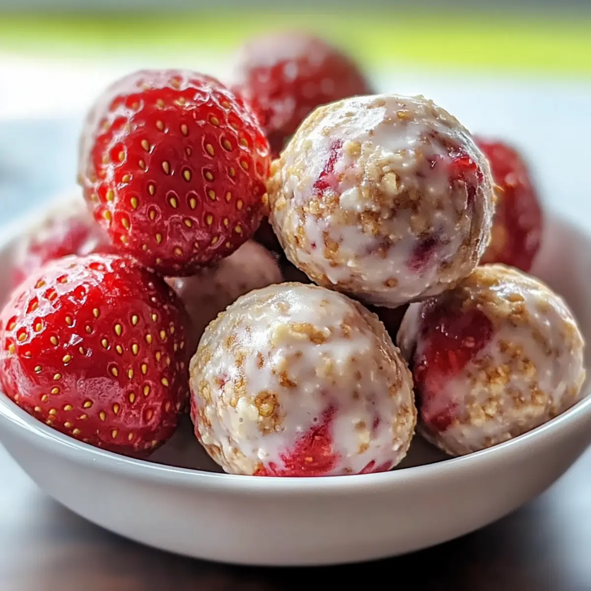 Gesunder Genuss: Mit einer Kombination aus frischen Erdbeeren und cremigem Käsekuchen fühlen sich diese Bällchen wie ein Dessert an, bieten aber gleichzeitig eine nährstoffreiche Snack-Alternative.