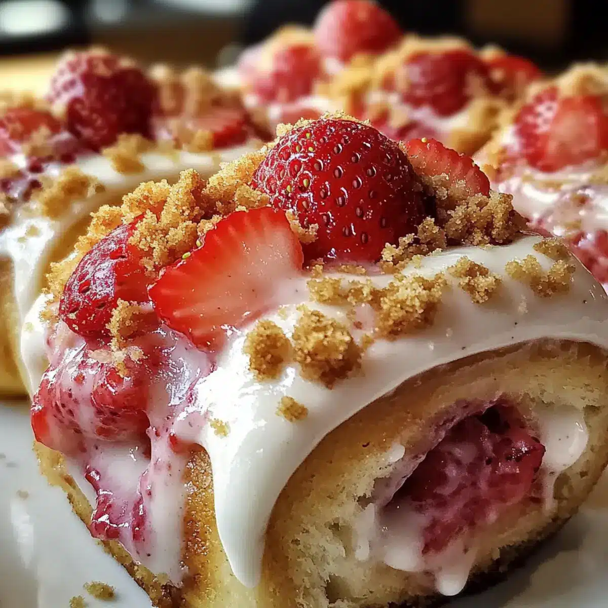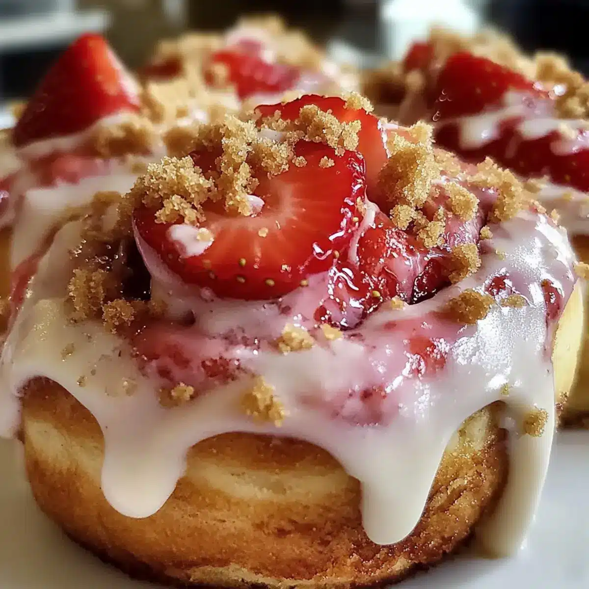 Nimm die Rolls aus dem Ofen und lasse sie einige Minuten abkühlen. Verteile dann das Frosting großzügig auf den warmen Cinnabon Rolls und bestreue sie mit Graham-Cracker-Bröseln sowie frischen Erdbeerscheiben, um ihnen eine hübsche und köstliche Note zu verleihen.