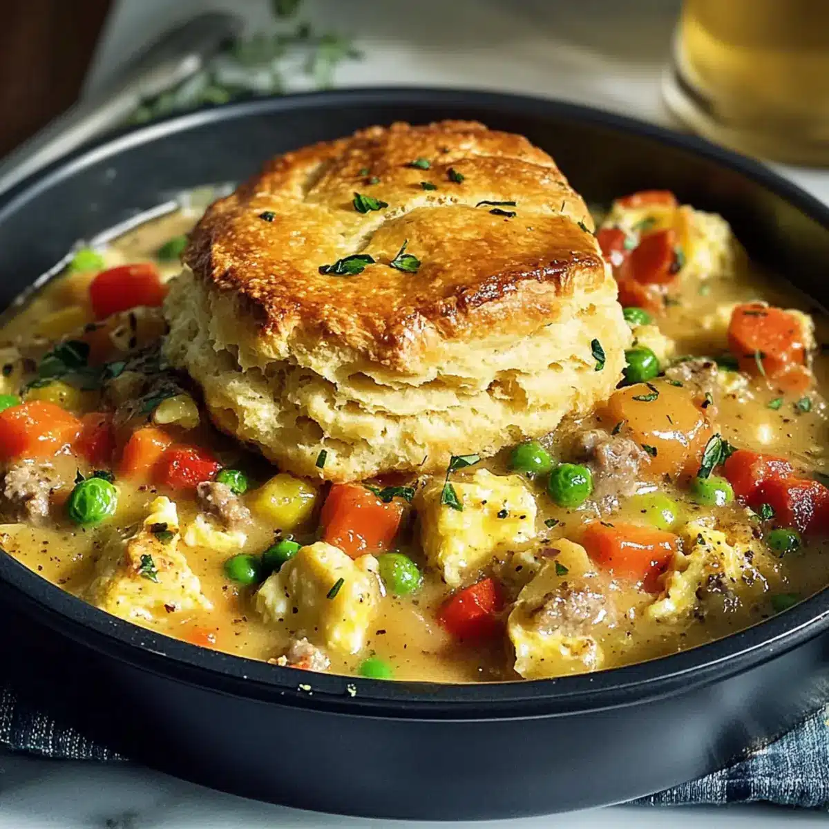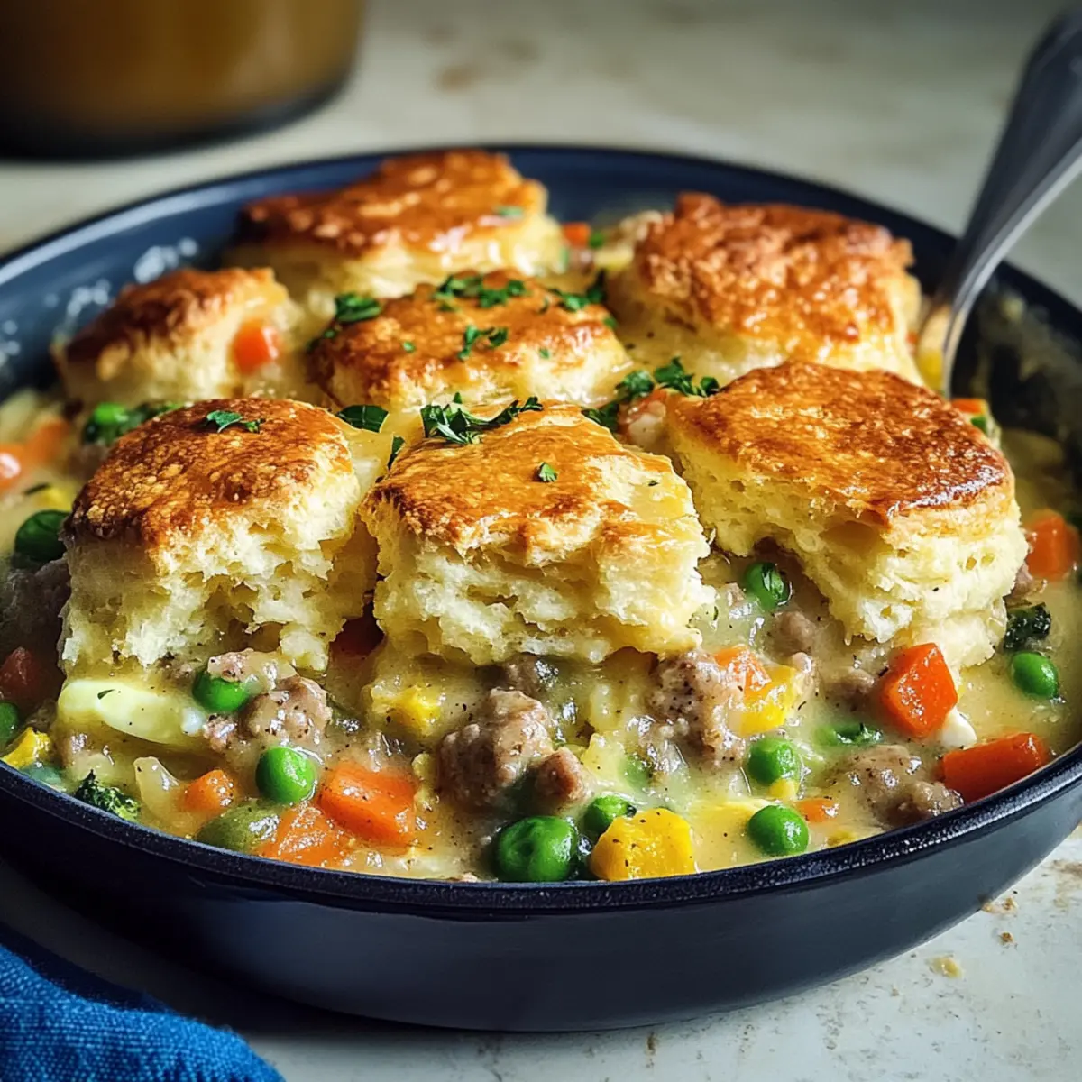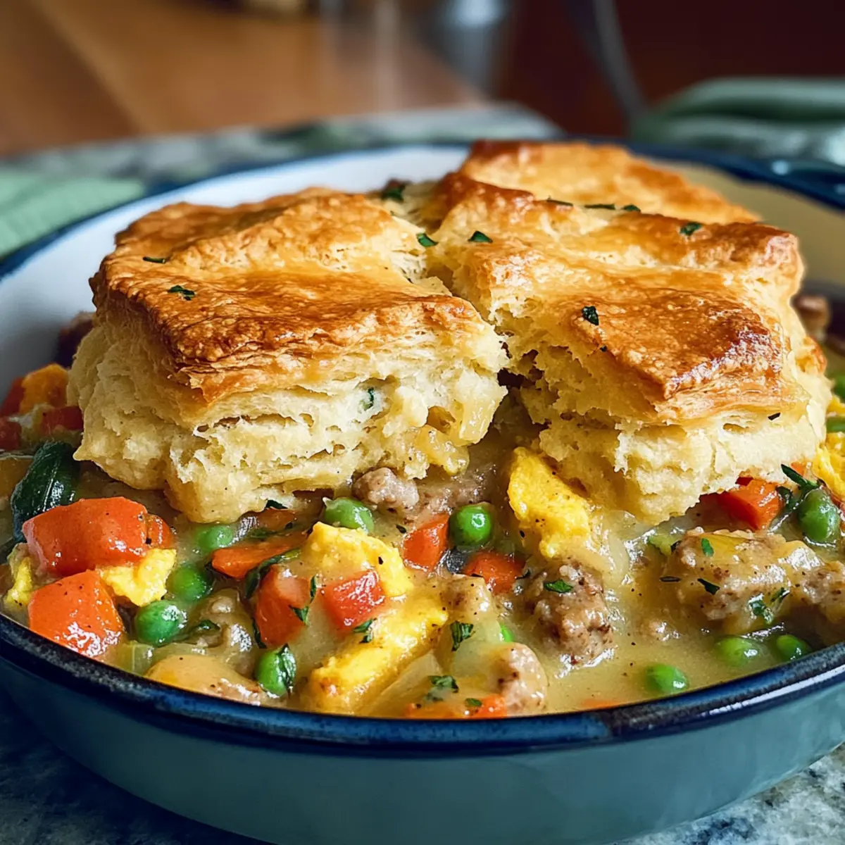 Es war einmal ein fauler Sonntagmorgen, an dem ich nach etwas Warmem und Herzhaftem verlangte. So entstand der Gedanke an einen Frühstücks-Pie, der nicht nur den Tag begrüßt, sondern auch das Gefühl von Gemütlichkeit auf den Tisch bringt. Mein Rezept für den Savory Breakfast Pot Pie mit Honigbutter-Biskuitkruste vereint fluffige Rühreier, kräftige Wurstsoße und eine bunte Auswahl an Gemüse in einem zarten Teigkleid. Dieser Frühstücks-Pie ist nicht nur eine Wohltat für die Seele, sondern auch besonders anpassungsfähig – du kannst die Zutaten ganz nach deinem Geschmack variieren! Zudem ist er ideal für Meal Prep geeignet und lässt sich einfach aufwärmen, wenn der Alltag ruft. Neugierig, wie du diesen köstlichen Pie selbst zubereiten kannst? Lass uns in die Details eintauchen!