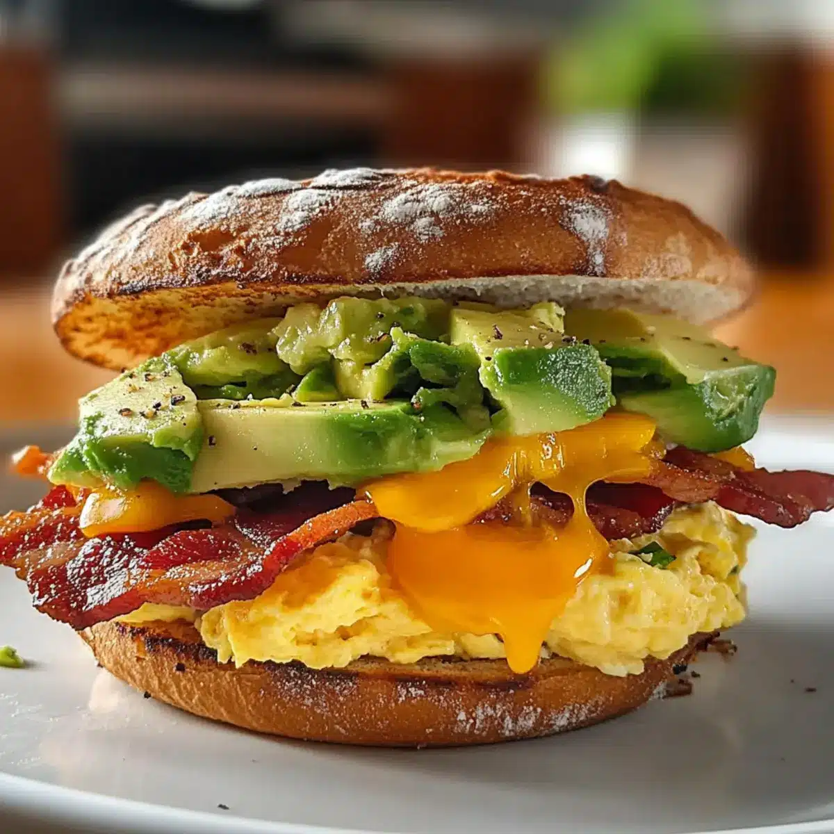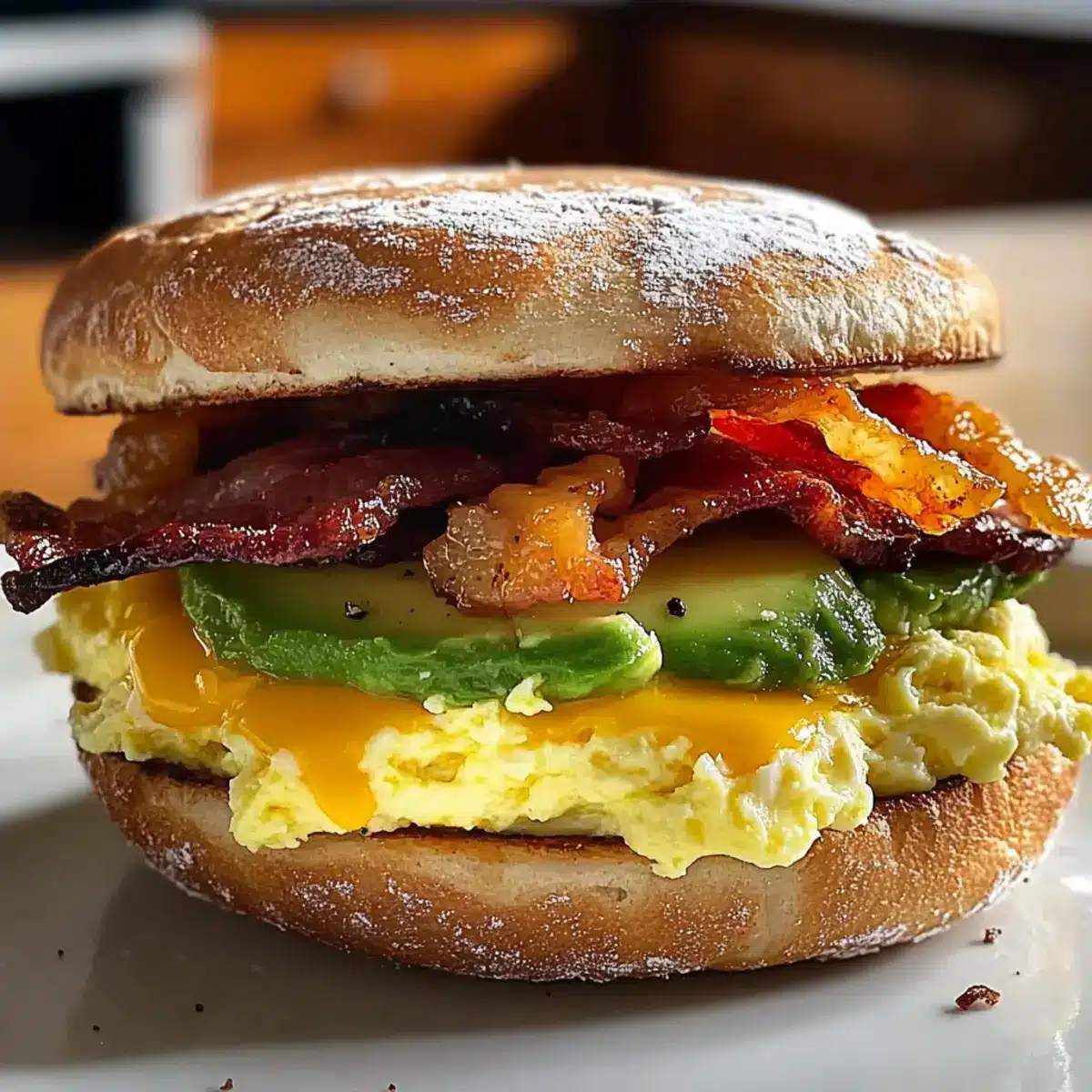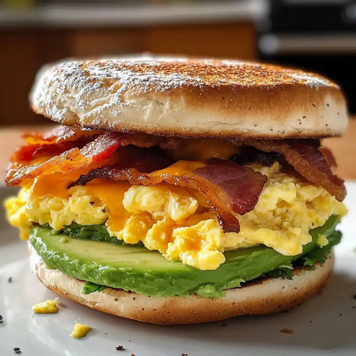 - Sandwich zusammenstellen: Auf der unteren Muffinhälfte verteile die Rühreier, gefolgt von Speck und Cheddar. Toppe mit der Avocado-Mischung.