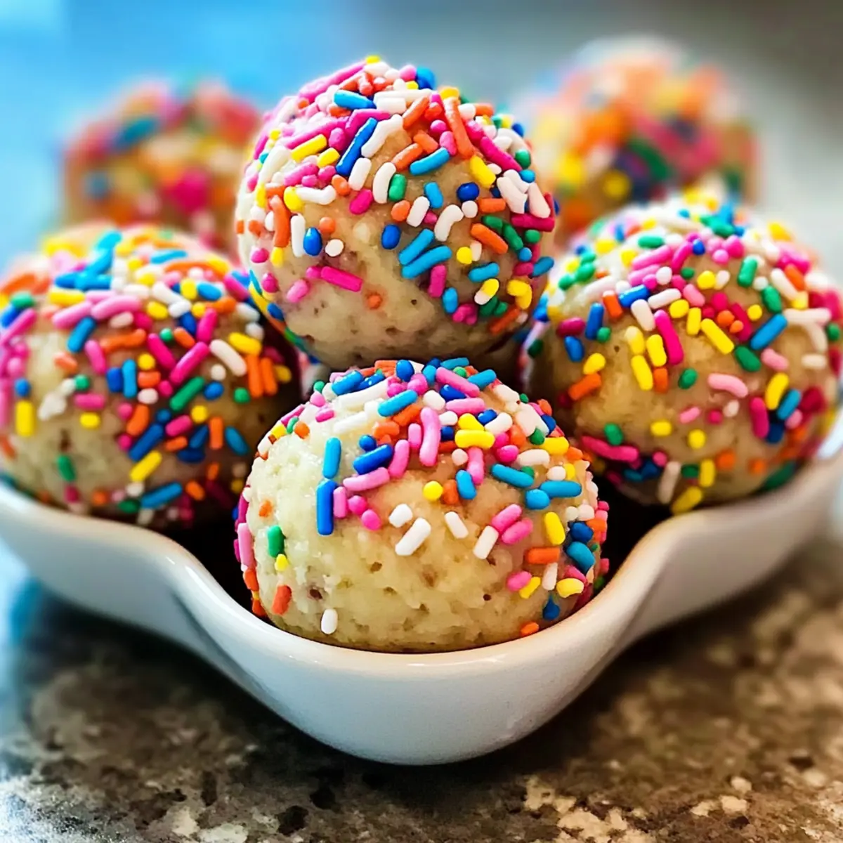 - Bereite einen Teller mit bunten Streuseln vor und rolle die Bälle darin.