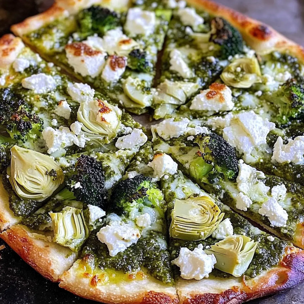 Grüne Pizza mit Pesto und Feta selbst gemacht