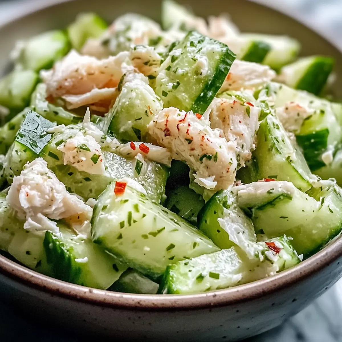Der Gurkensalat Krabbenfleisch lässt sich hervorragend im Voraus zubereiten, was Ihnen wertvolle Zeit an einem hektischen Tag spart. Sie können die Gurken bis zu 24 Stunden im Voraus vorbereiten, indem Sie sie in Streifen schneiden, leicht salzen und 10 Minuten ruhen lassen, um überschüssige Feuchtigkeit zu entfernen. Das zerkleinerte Krabbenfleisch kann ebenfalls bis zu 3 Tage im Voraus zubereitet und in einem luftdichten Behälter im Kühlschrank aufbewahrt werden. Für das Dressing empfehle ich, dieses separat zu mixen und ebenfalls kühl zu lagern, um die Frische zu erhalten. Wenn Sie bereit sind zu servieren, einfach alle Komponenten zusammenmischen und den Salat sanft umrühren, um die zarte Textur des Krabbenfleischs zu bewahren. So genießen Sie mit minimalem Aufwand ein erfrischendes und leckeres Gericht!
