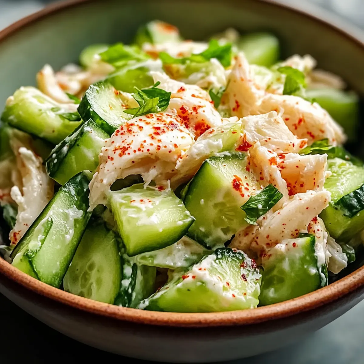 Frische Aromen: Der Gurkensalat mit Krabbenfleisch begeistert mit seiner Kombination aus knackigen Gurken und zartem Krabbenfleisch, die ein wunderbares Geschmackserlebnis bieten.