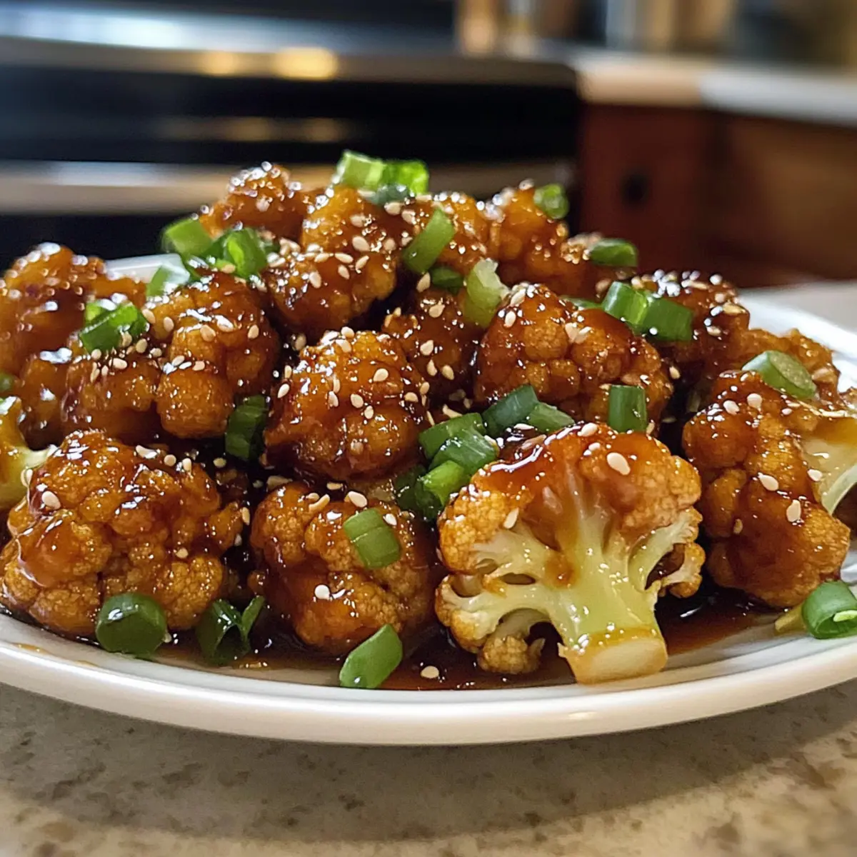 Servieren Sie den Honig Knoblauch Blumenkohl sofort, während er noch heiß ist. Dieser schmackhafte Blumenkohl eignet sich hervorragend als Hauptgericht oder als Beilage zu Reis oder Nudeln. Garnieren Sie das Gericht nach Belieben mit Sesamsamen oder gehackten Frühlingszwiebeln für zusätzlichen Geschmack und eine ansprechende Präsentation.