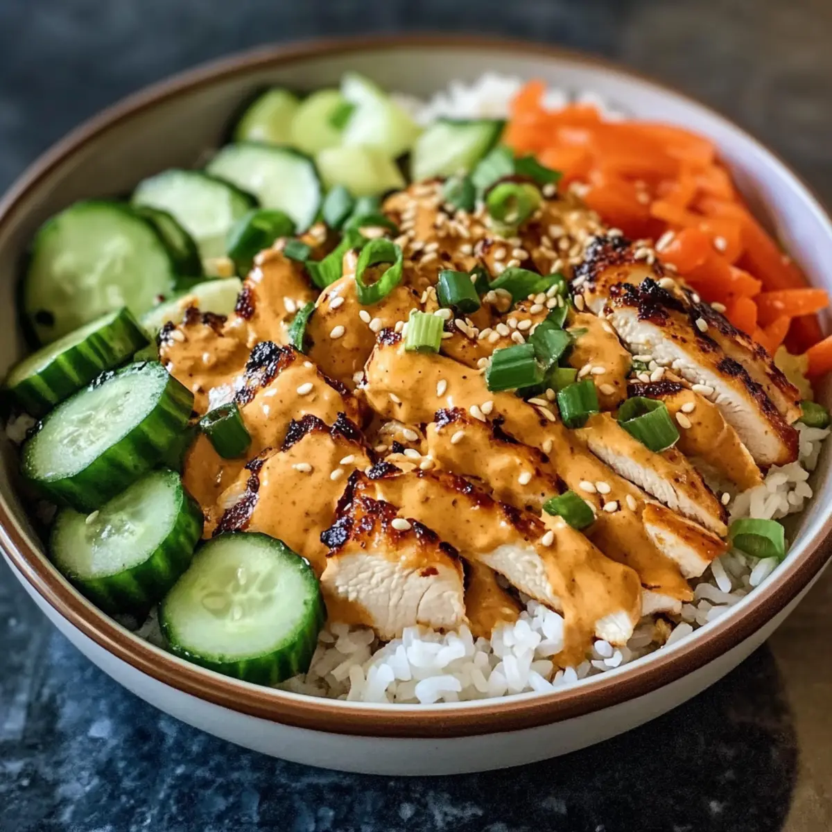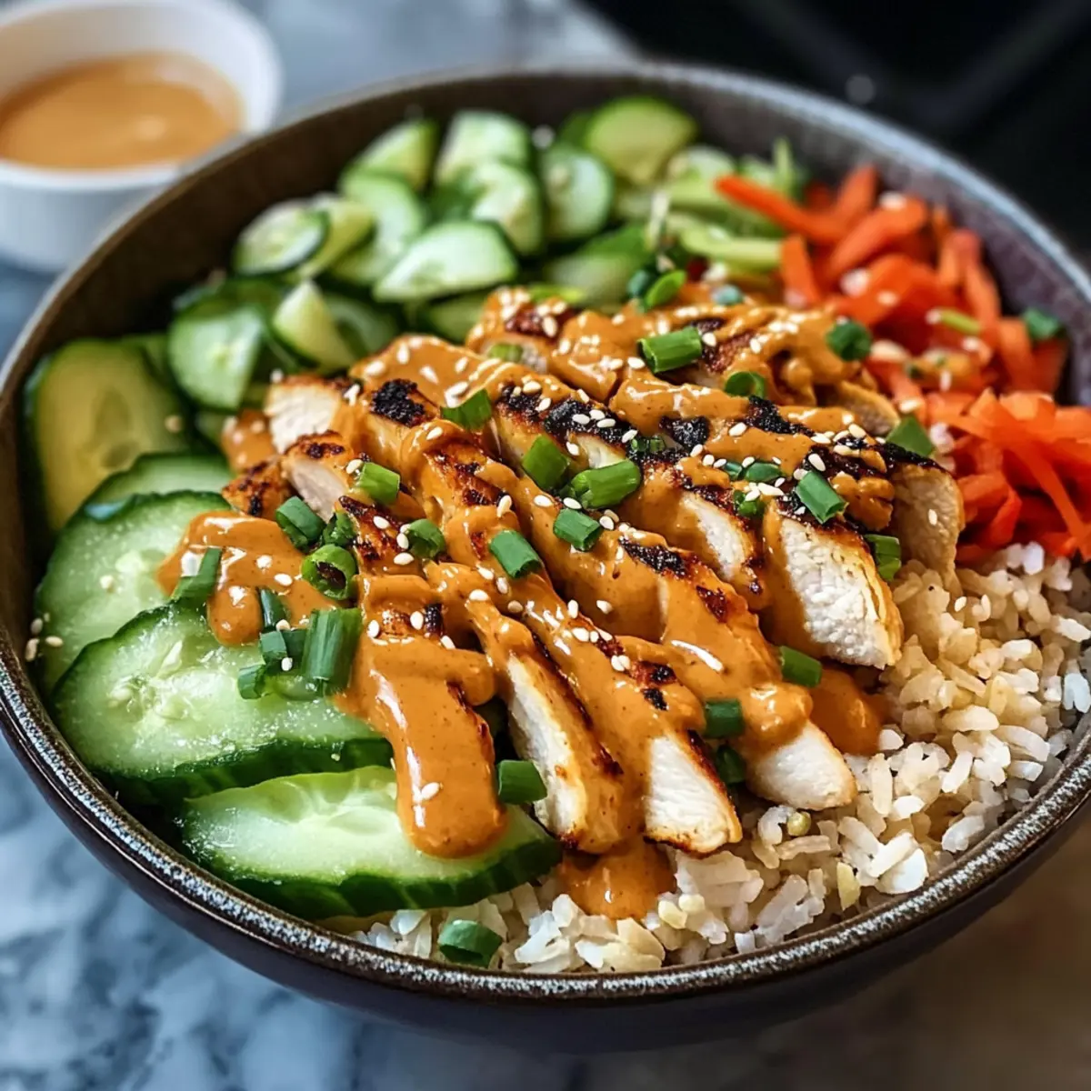 Legen Sie die goldbraun gebratenen Hähnchenstreifen oben auf jede Schüssel. Träufeln Sie großzügig die vorbereitete Erdnusssauce über das Hähnchen und die Gemüse. Garnieren Sie jede Schüssel nach Belieben mit gehackten Frühlingszwiebeln und einem Spritzer Sesamsamen für extra Knusprigkeit und visuelle Attraktivität.