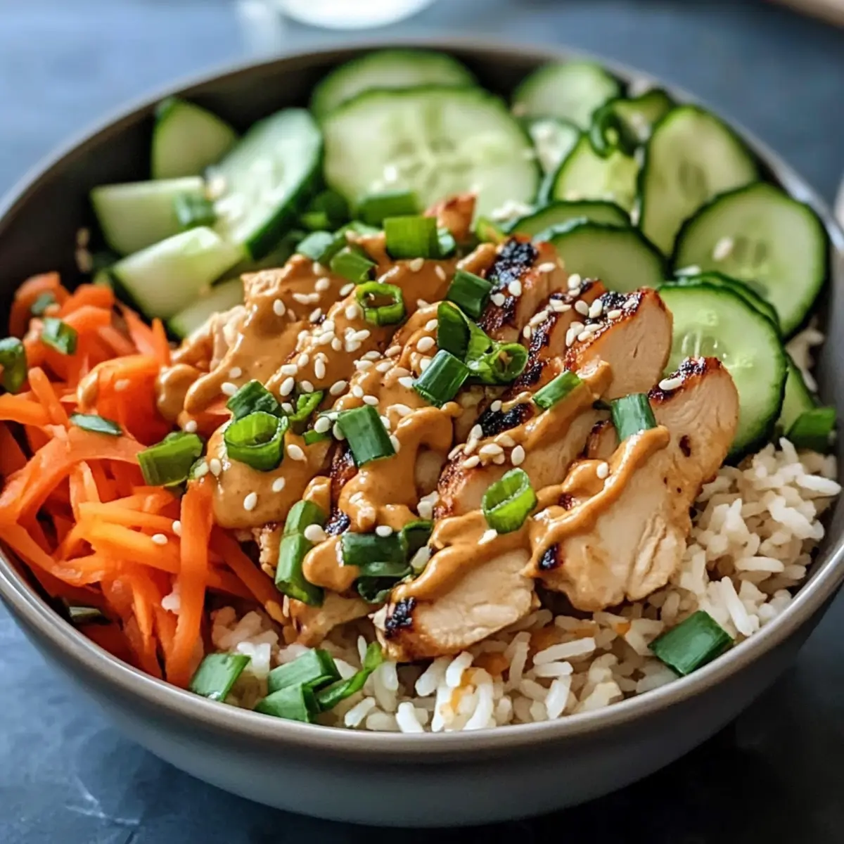 - Schüsseln vollenden: Legen Sie die Hähnchenstreifen auf jede Schüssel, träufeln Sie die Erdnusssauce darüber und garnieren Sie mit Frühlingszwiebeln und Sesamsamen.