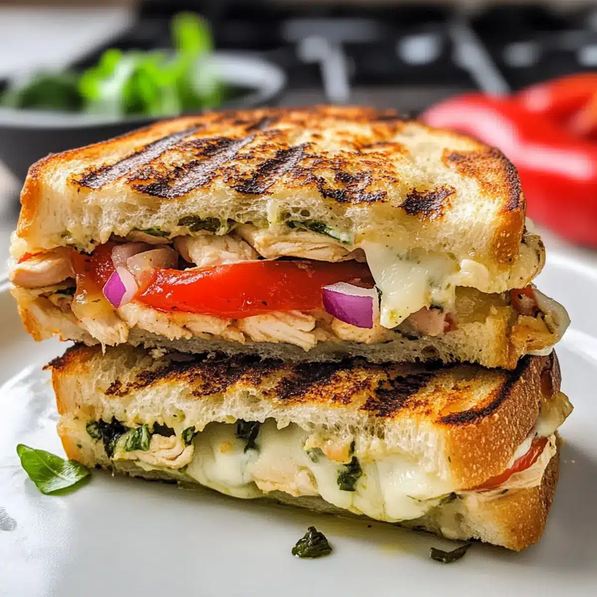 Perfekte Füllung: Achte darauf, geröstete Paprika gut abzutropfen und trocken zu tupfen, um einen durchweichten Panini zu verhindern und das italienische Huhn knusprig zu halten.