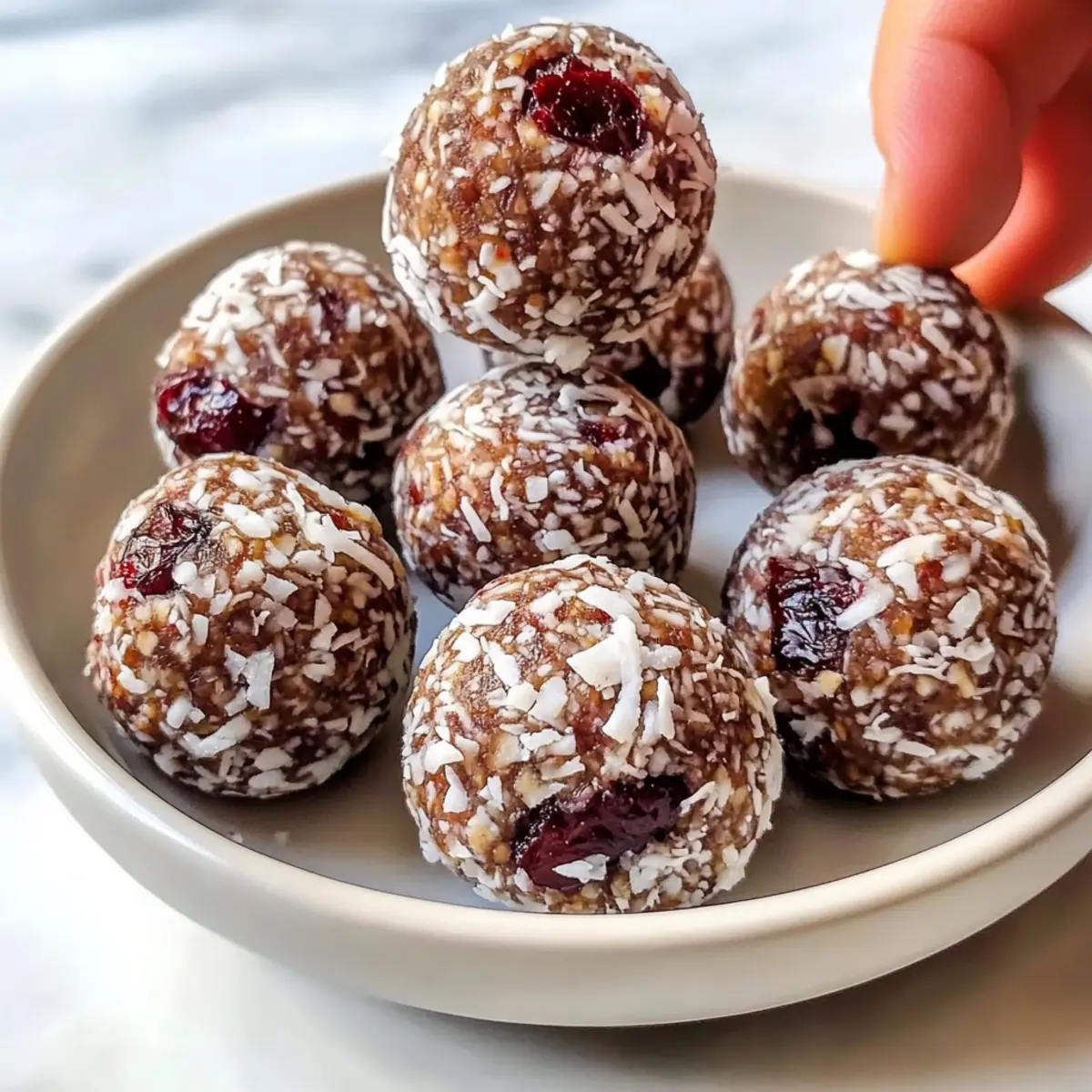 - Nimm etwa einen Esslöffel der Mischung und forme kleine Bällchen. Wälze sie optional in geraspelter Kokosnuss.