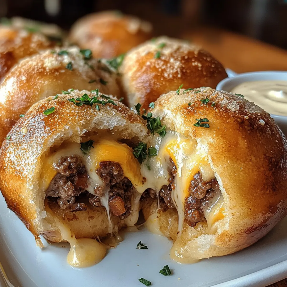 Genießen Sie die köstlichen Knoblauch Parmesan Cheeseburger Bomben mit den besten Dips und lassen Sie sich von jedem Bissen verzaubern!