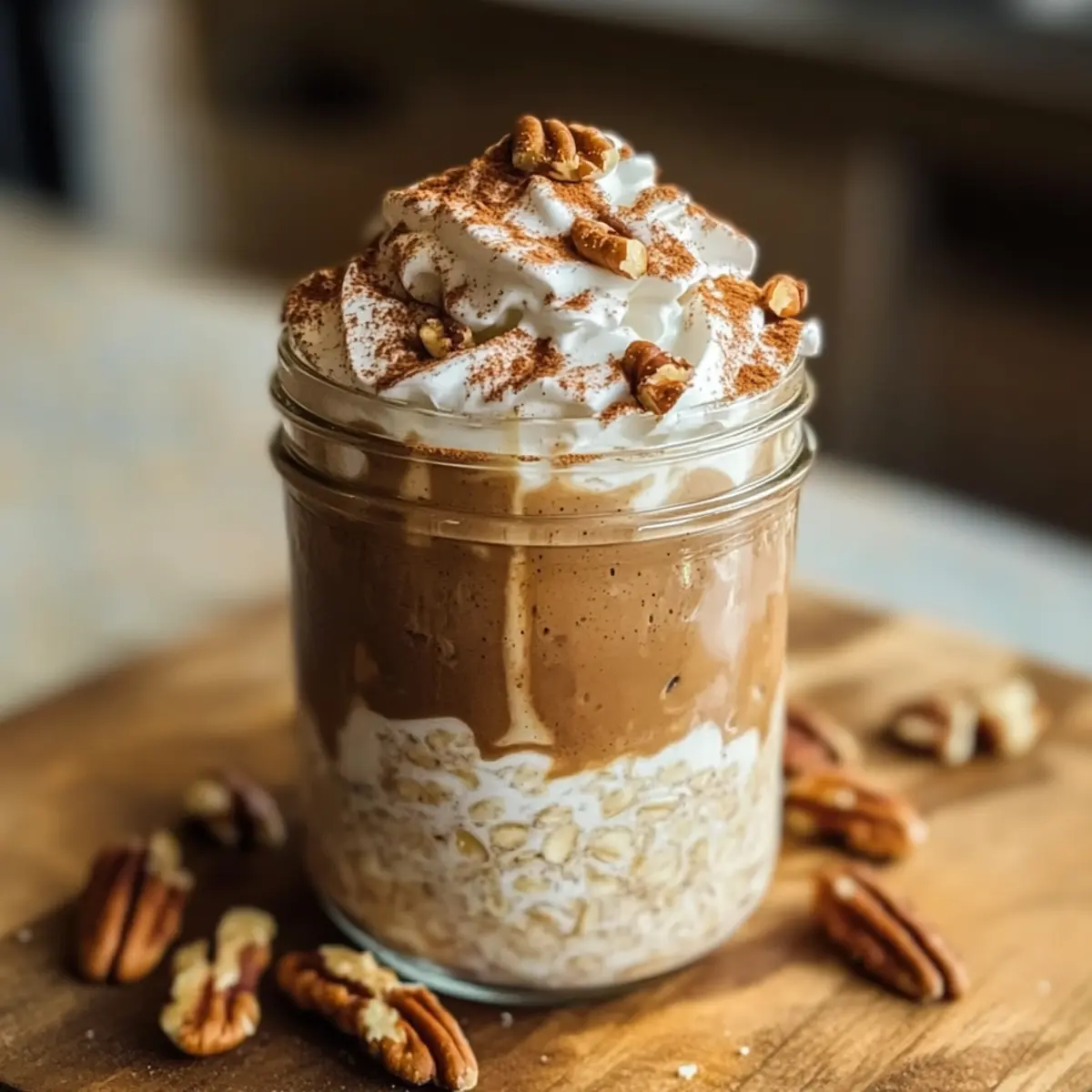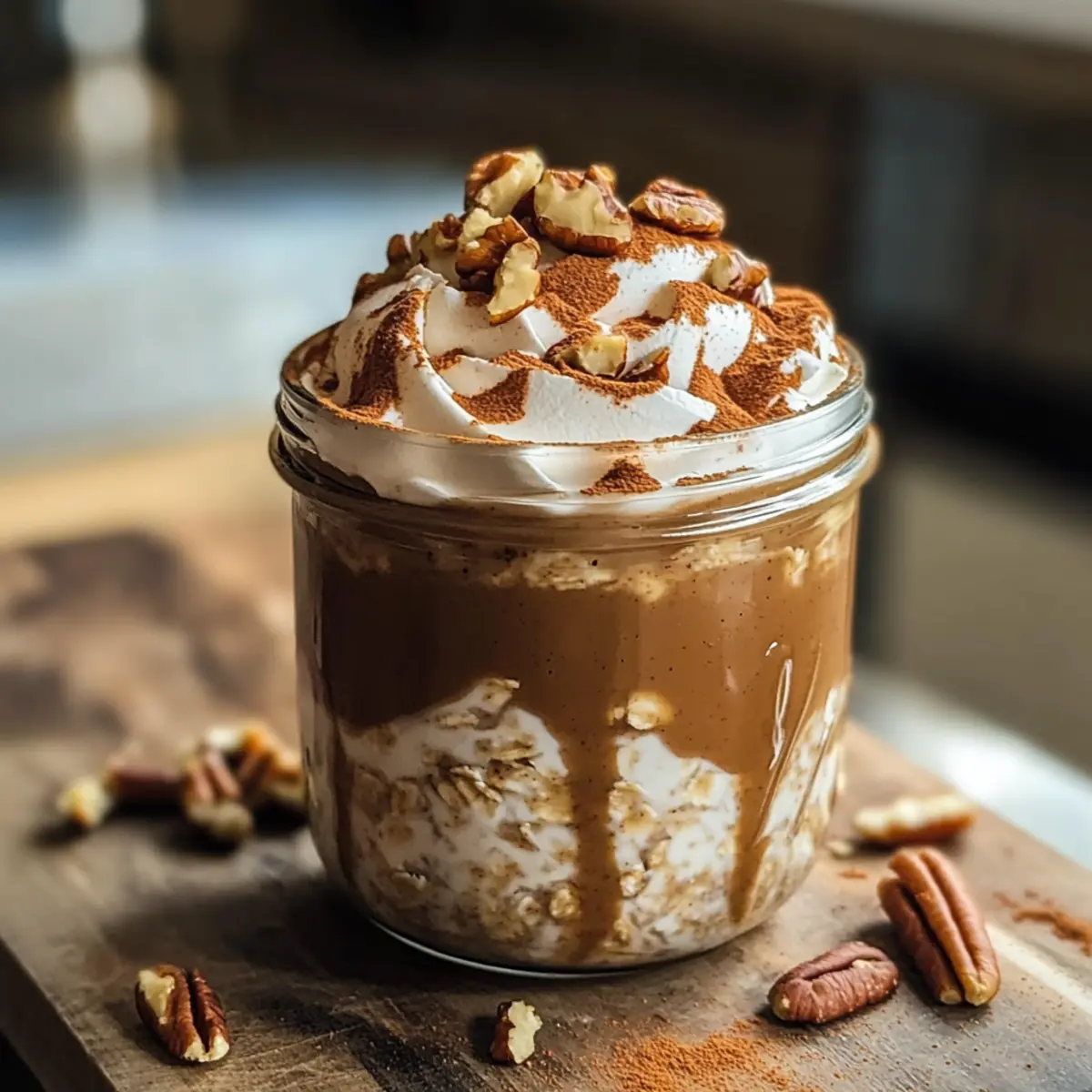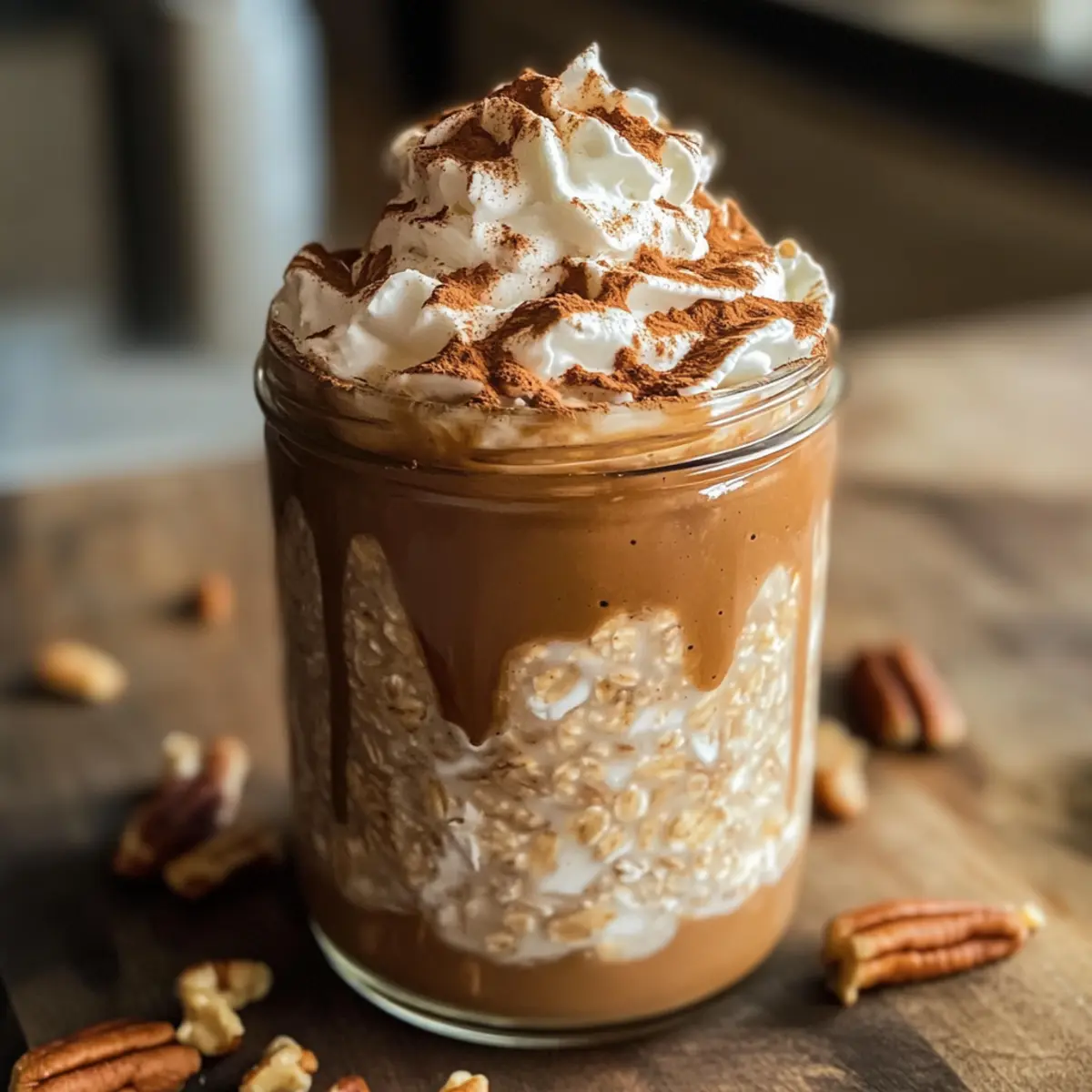 - Füge nach Belieben Kokosnuss-Whip hinzu, streue gehackte Pekannüsse und Zimtzucker darüber, und genieße die Overnight Oats.