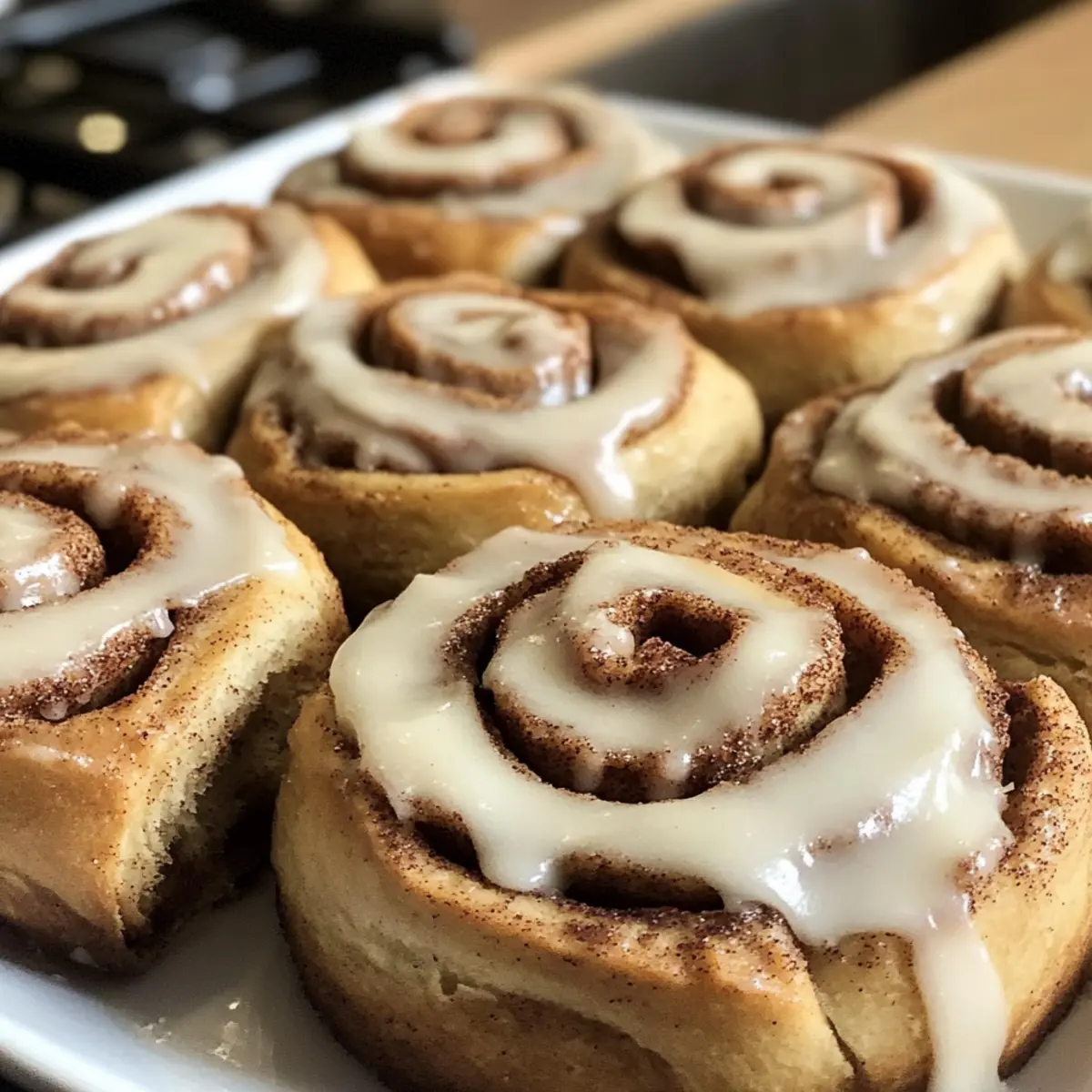 - Verteile das Frosting über die warmen Zimtschnecken.