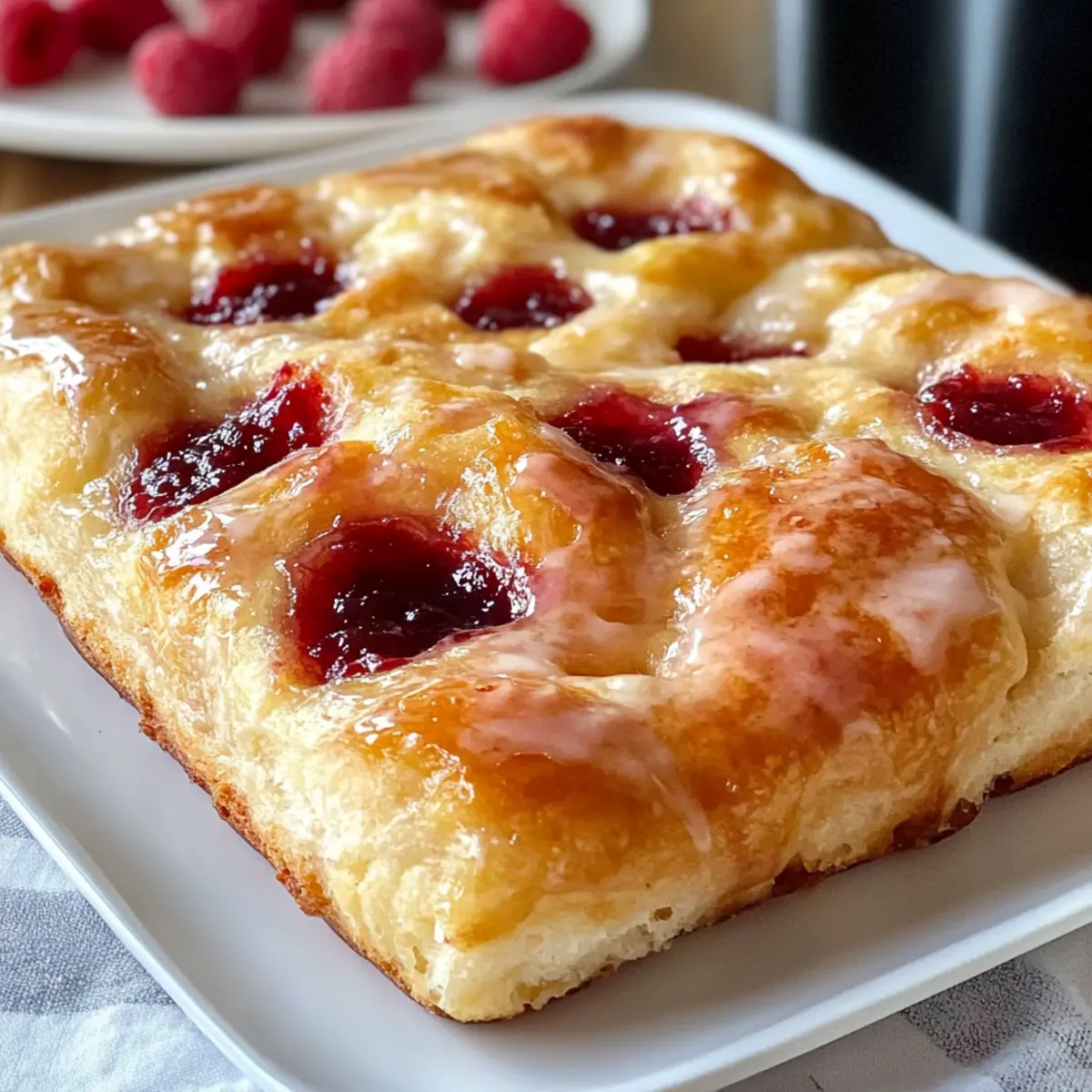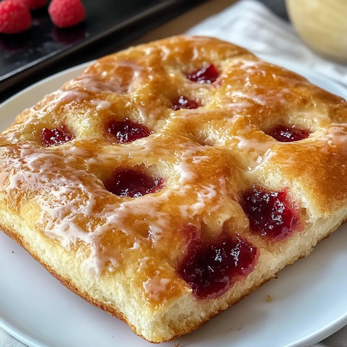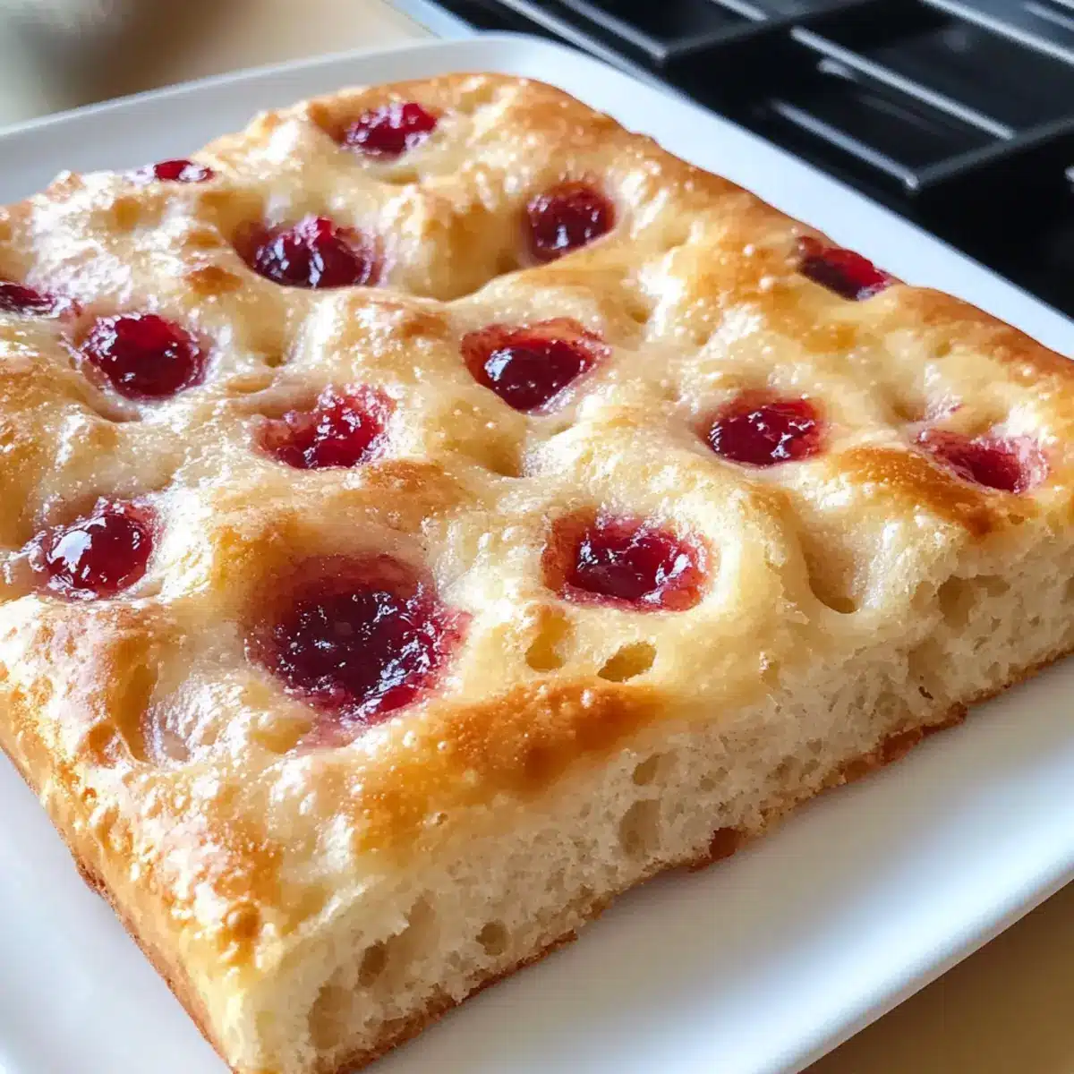 - Nach dem Backen weitere Löcher in die Focaccia stechen und mit Himbeermarmelade füllen.