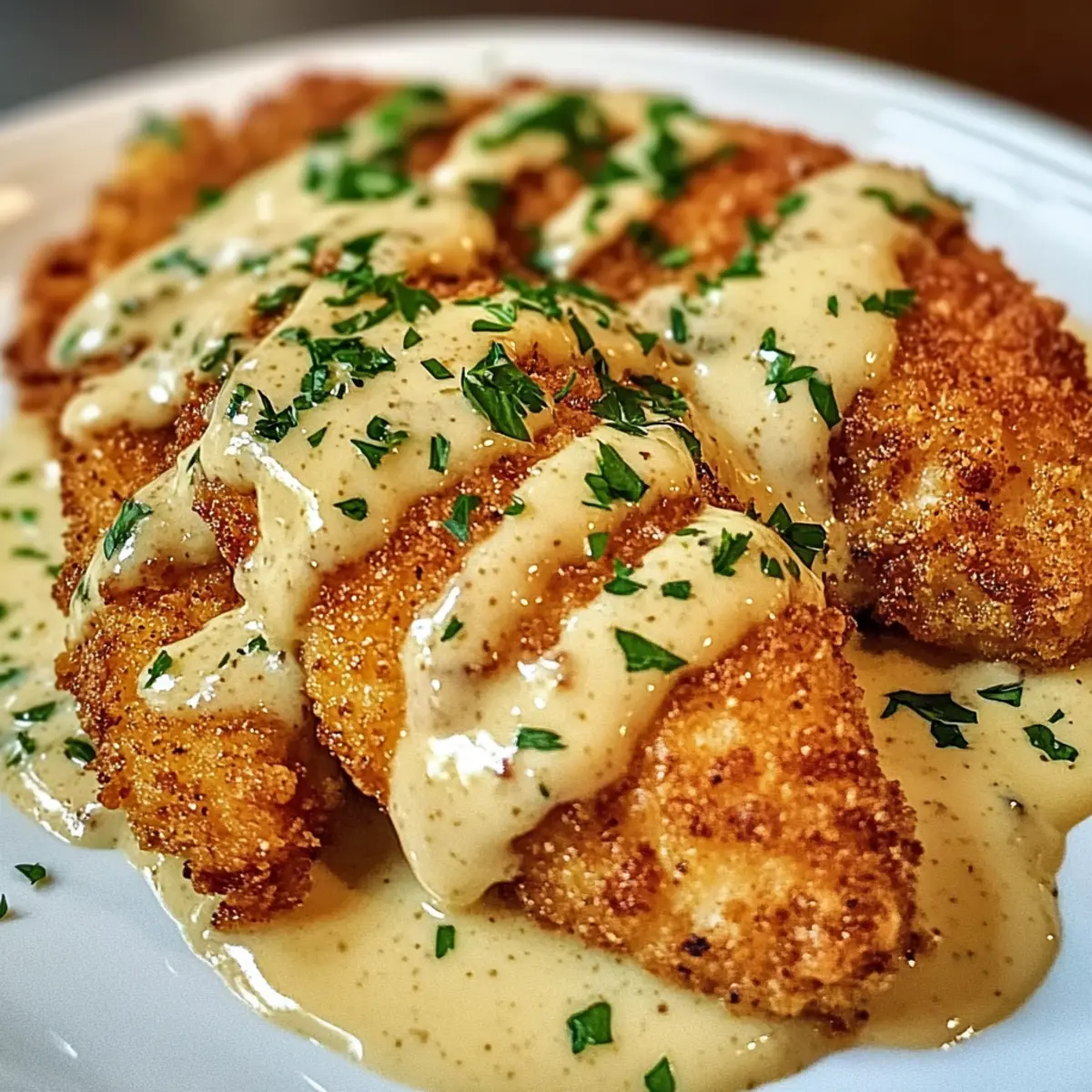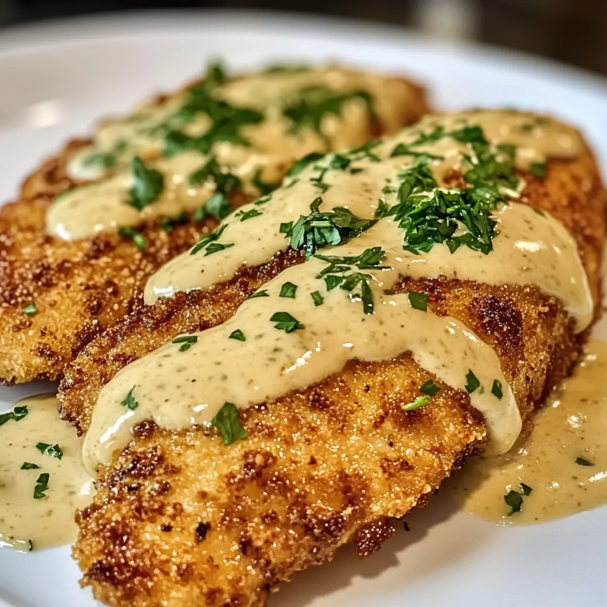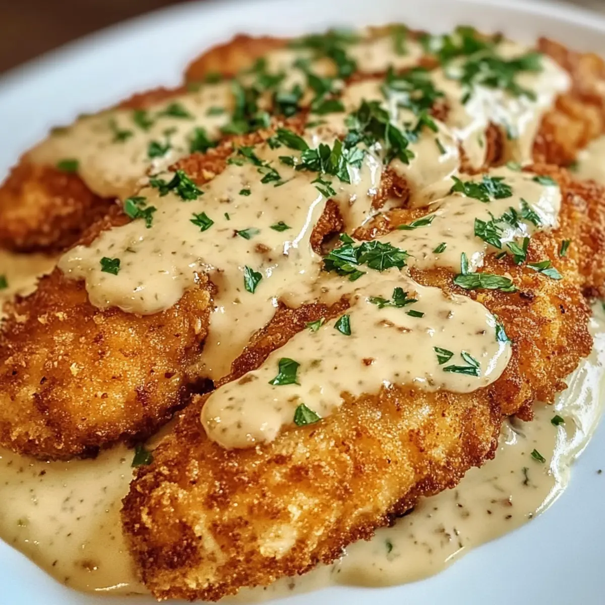 - Hähnchenfilets auf Tellern anrichten, Alfredo-Sauce darüber geben und mit frischer Petersilie garnieren.