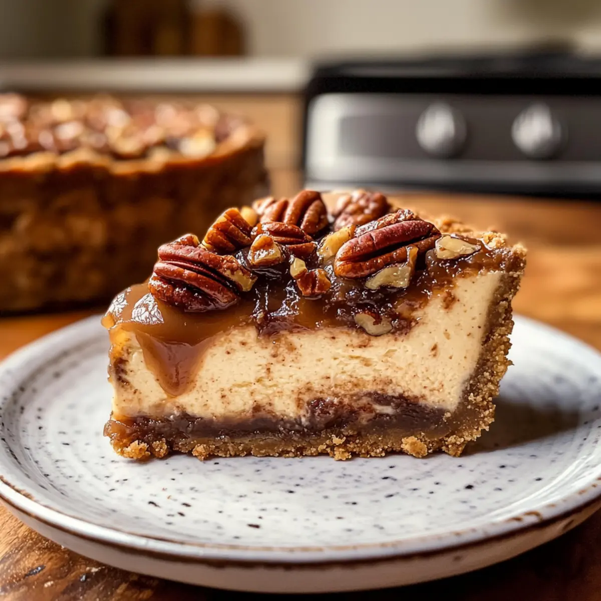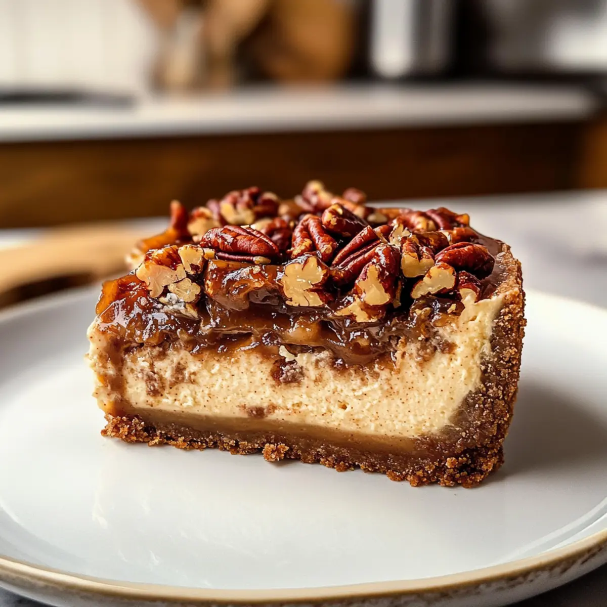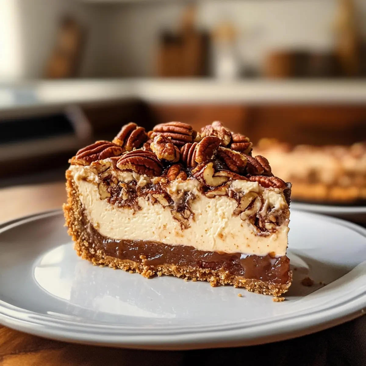 Karamell-Schicht: Eine Schicht Karamellsauce zwischen den Cheesecake- und Pecan-Schichten macht den Kuchen noch himmlischer und verleiht ihm eine luxuriöse Textur.