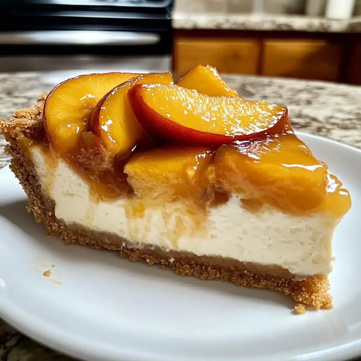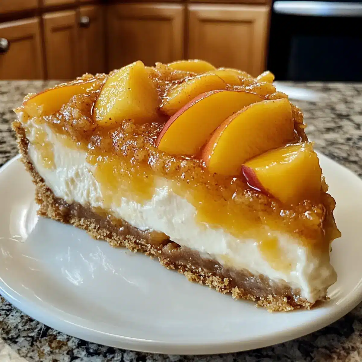 Fruchtige Süße: Die Kombination aus frisch gebackenen Pfirsichen und cremigem Käsekuchen sorgt für ein einzigartiges Geschmackserlebnis, das die Sinne verführt.
