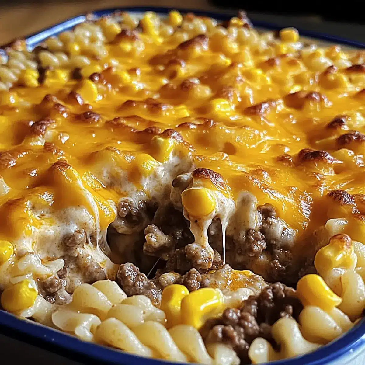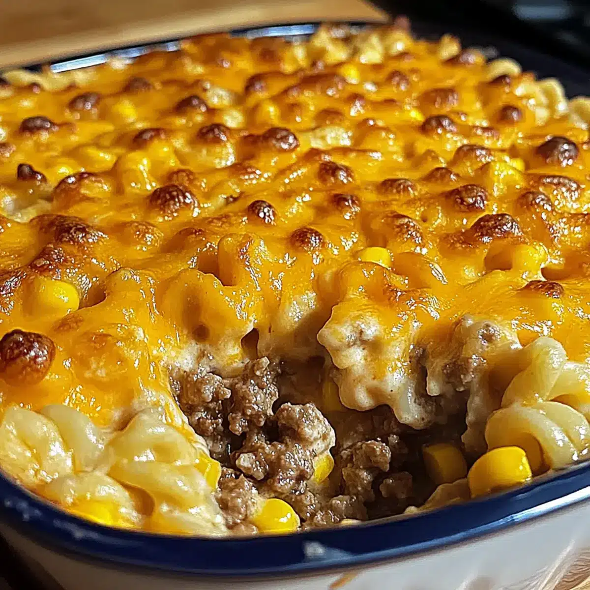 Streuen Sie eine weitere Tasse geriebenen Cheddar-Käse oben auf den Auflauf. Wenn Sie möchten, können Sie auch etwas Semmelbrösel oder zerdrückte Chips hinzufügen, um eine knusprige Kruste zu erzielen. Diese Schicht sorgt für einen ansprechenden Kontrast zur cremigen Füllung.