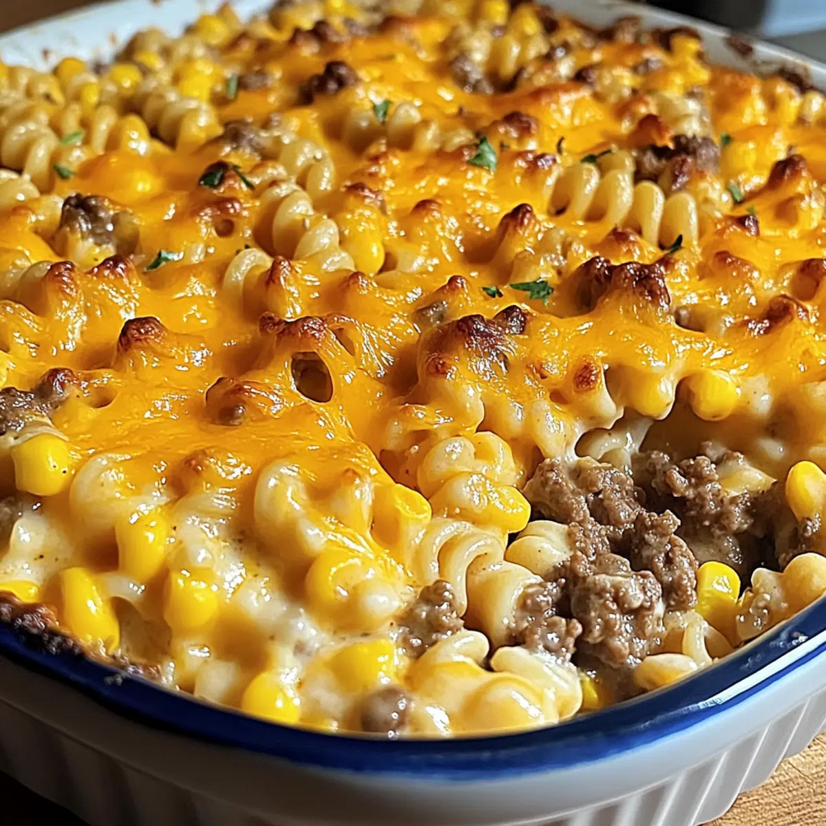 Fügen Sie 1 Tasse Maiskörner und 2 Tassen vorgekochte Rotini-Pasta in die Pfanne hinzu. Mischen Sie alles gründlich, bis die Pasta und der Mais gleichmäßig mit der würzigen Hackfleischmischung bedeckt sind. Die Kombination sollte gut duften und Farben annehmen, die zum Appetit anregen.