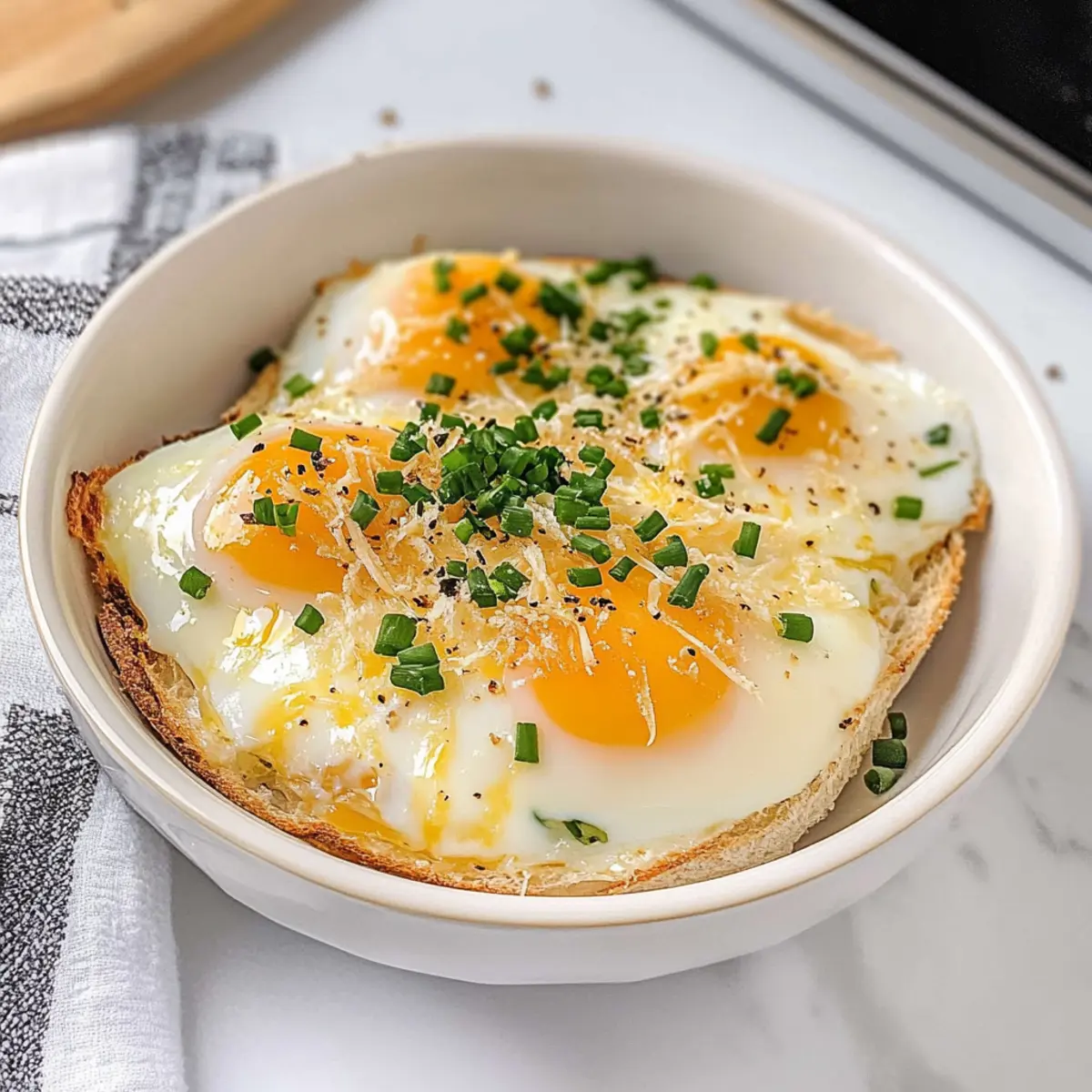 - Streue frisch gehackten Schnittlauch und geriebenen Parmesan gleichmäßig über die Eier.