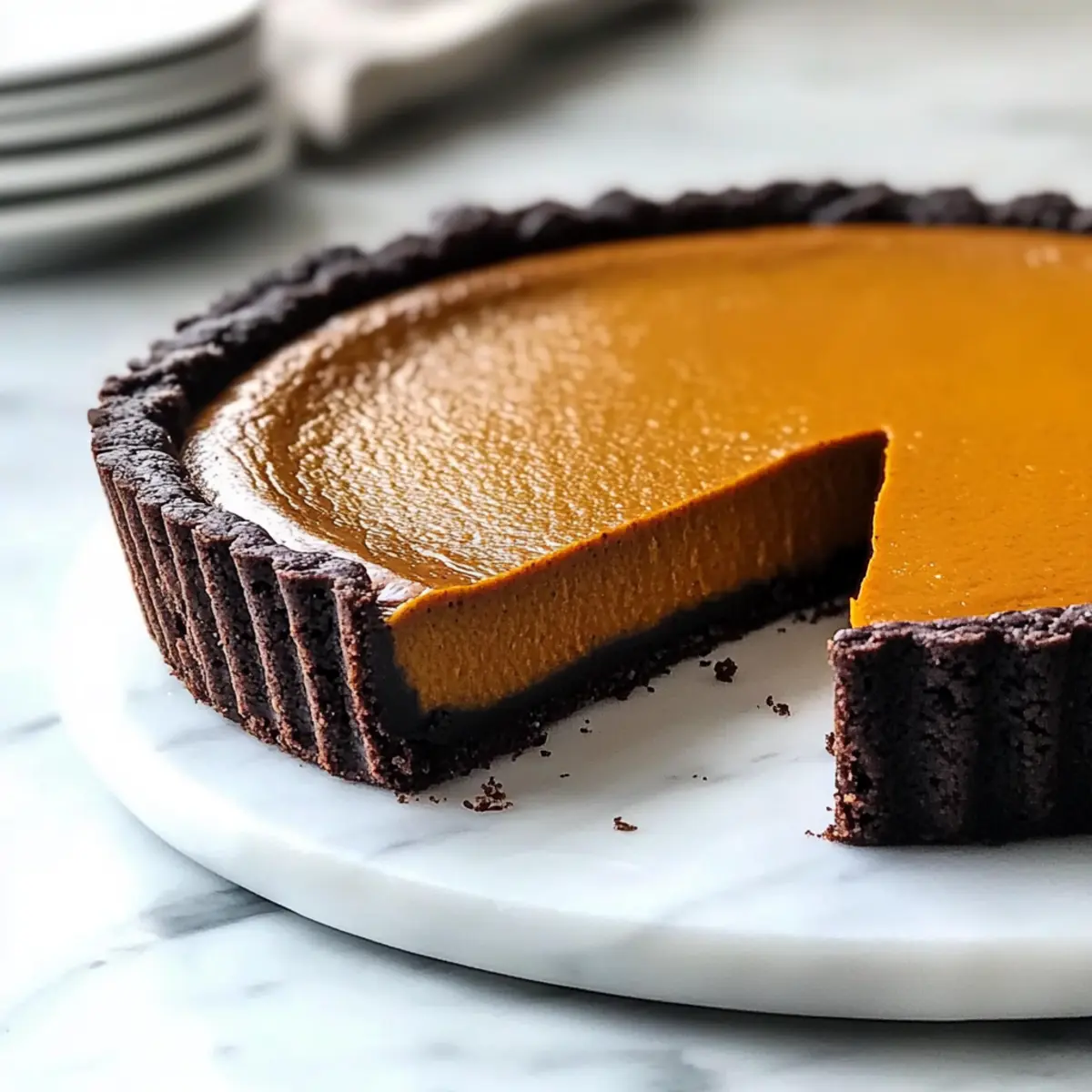 Diese Schokoladen-Kürbis-Tarte ist ideal für alle, die Zeit sparen und trotzdem ein köstliches Dessert kreieren möchten! Du kannst den Boden bis zu 24 Stunden im Voraus zubereiten und fest in Frischhaltefolie verpacken, um ihn frisch zu halten. Ebenso kann die Kürbisfüllung bis zu 3 Tage im Voraus zubereitet und im Kühlschrank aufbewahrt werden – so lassen sich die Aromen entfalten. Wenn du bereit bist zu servieren, gieße einfach die Füllung in den vorgebackenen Boden und backe die Tarte, wie in den Anweisungen beschrieben. Dadurch sparst du wertvolle Zeit am Tag der Veranstaltung, und deine Tarte bleibt genauso köstlich und eindrucksvoll!