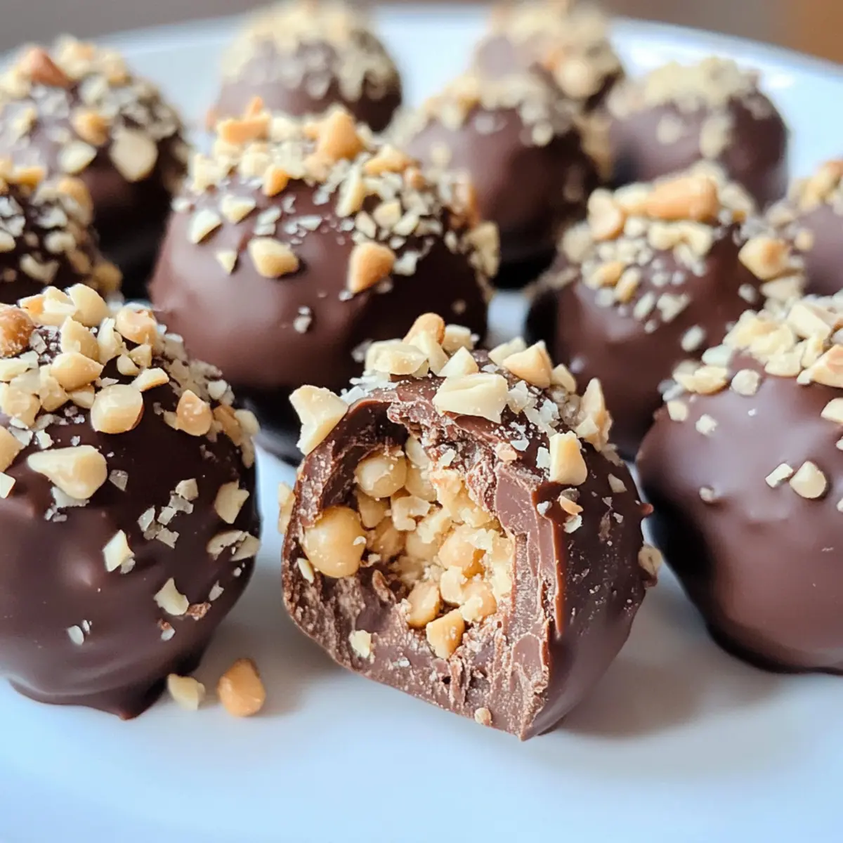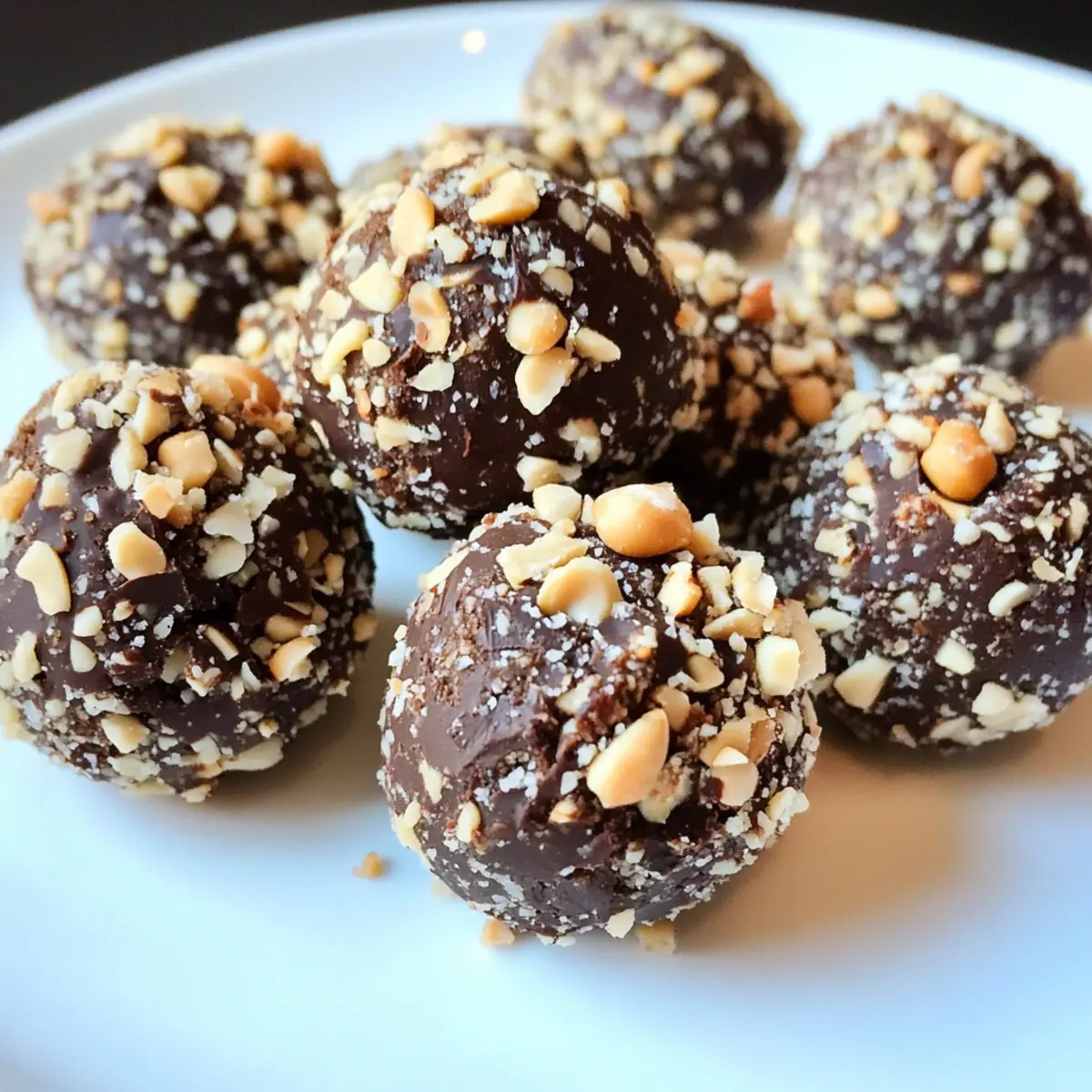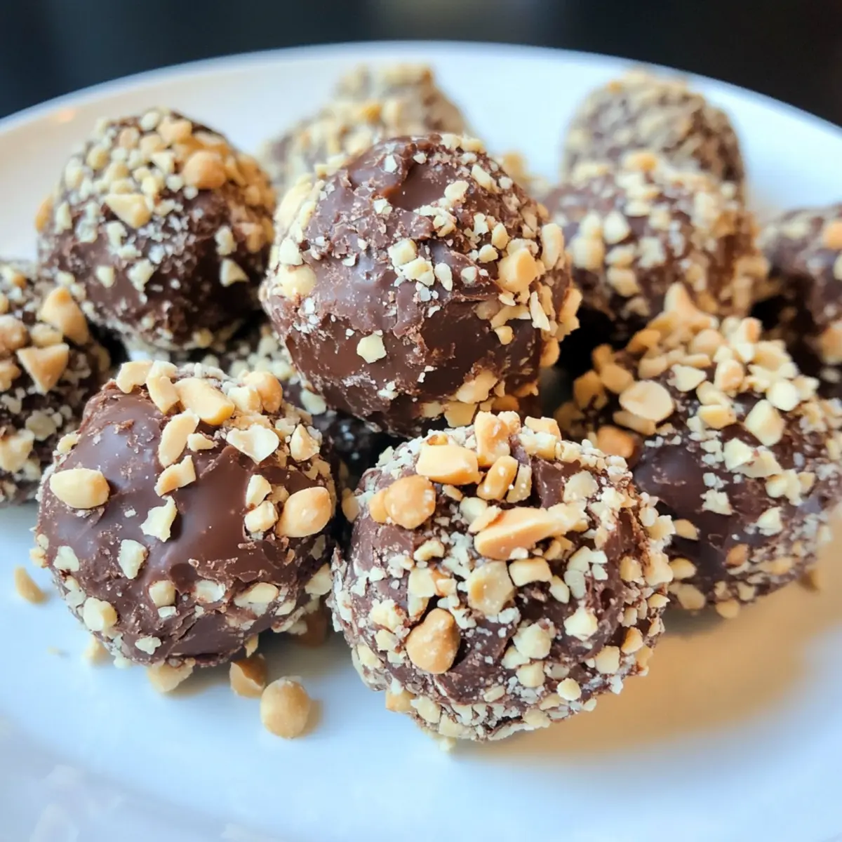 Rolle die geformten Bällchen in den gehackten Erdnüssen, bis sie gleichmäßig bedeckt sind. Drücke dabei sanft, damit die Erdnüsse haften bleiben. Achte darauf, dass die Schokoladenkikernüsse rundherum schön eingehüllt sind, um den perfekten Crunch zu erreichen und die Präsentation zu verbessern.