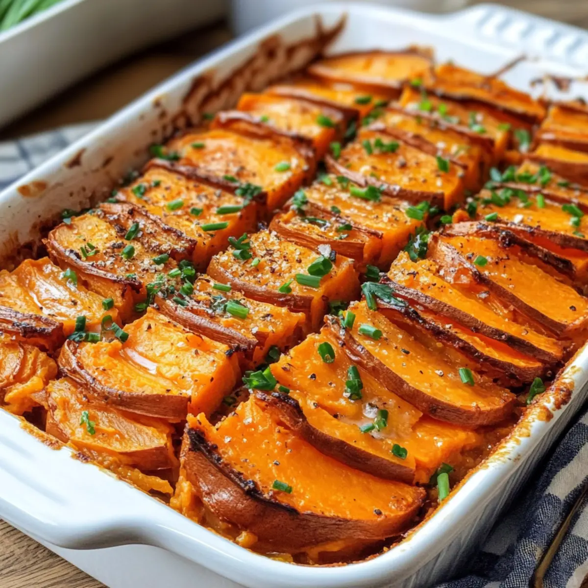 Karamellisierte Zwiebeln: Garniere deinen Süßkartoffelauflauf mit süßen, karamellisierten Zwiebeln für einen zusätzlichen geschmacklichen Kick. Ihre Süße bildet eine köstliche Ergänzung zur cremigen Basis.