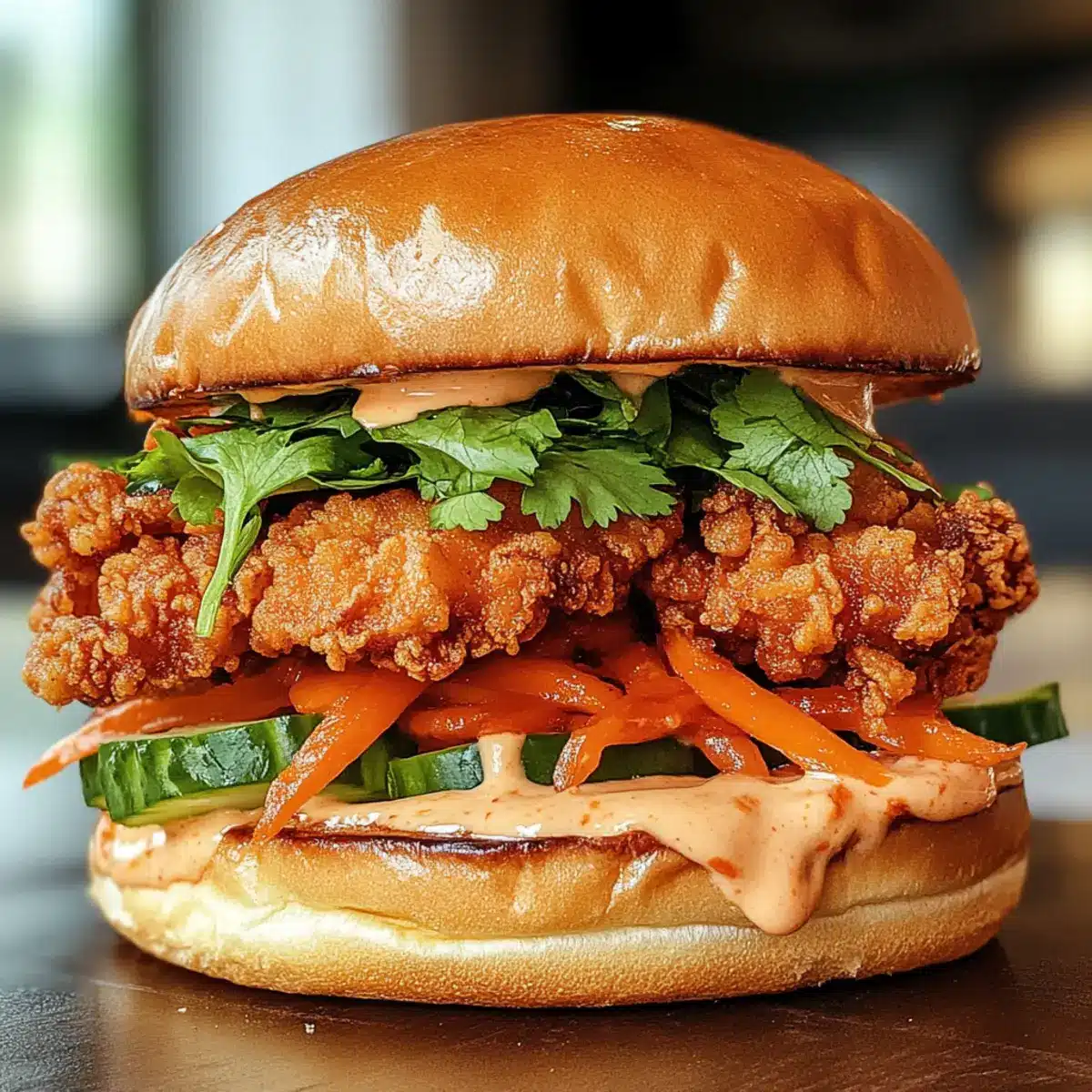 - Sandwich zusammenstellen: Toaste die Brötchen leicht, gebe die Sauce auf das untere Brötchen, platziere das Hähnchen und füge Gurkenscheiben, eingelegte Karotten und frische Kräuter hinzu.
