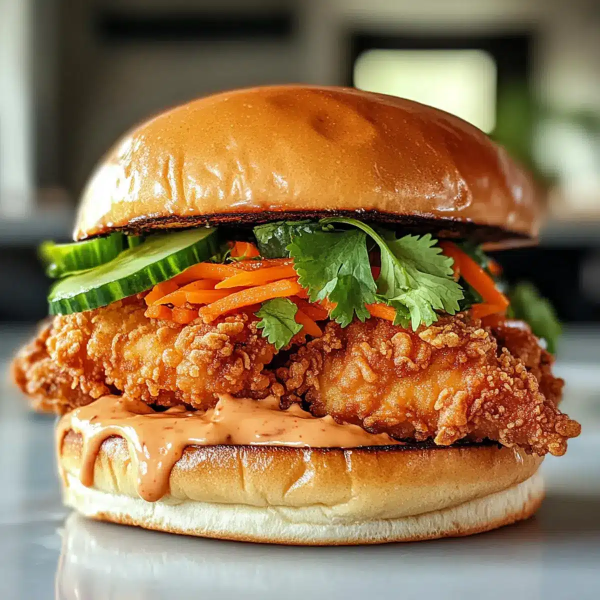 Toaste die Brötchen leicht für zusätzlichen Crunch. Beginne mit einer großzügigen Schicht der vorbereiteten Sauce auf dem unteren Brötchen. Platziere das frisch frittierte Hähnchen darauf und füge Gurkenscheiben, eingelegte Karotten und frische Kräuter hinzu, um das Sandwich zu vervollständigen.