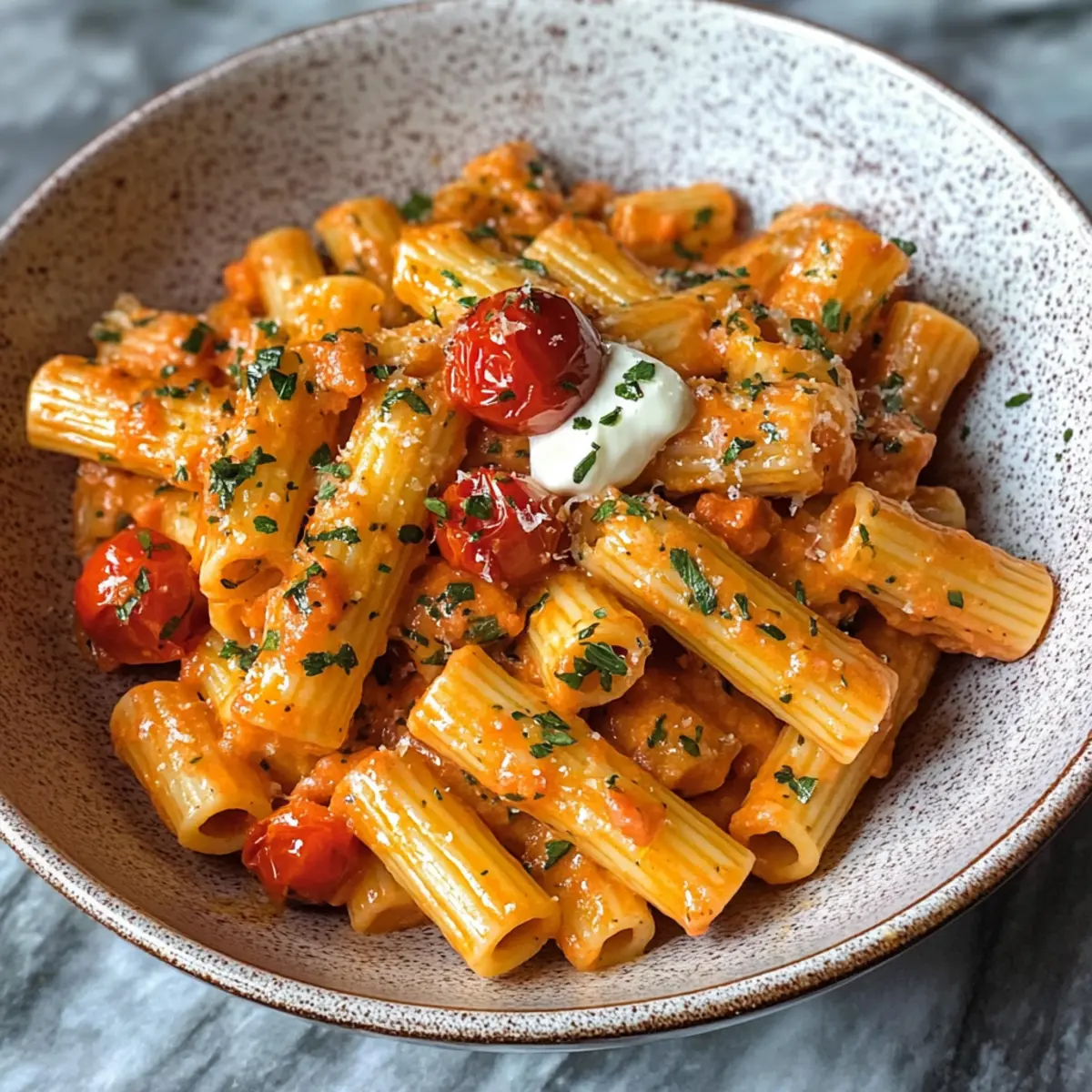 Füge 300 g vorgekochte Rigatoni hinzu und rühre die Pasta gut in die Sauce, sodass sie gleichmäßig bedeckt ist. Lasse die Rigatoni weitere 5 Minuten in der Sauce ziehen und decke die Pfanne ab, damit die Aromen sich gut vermischen können.