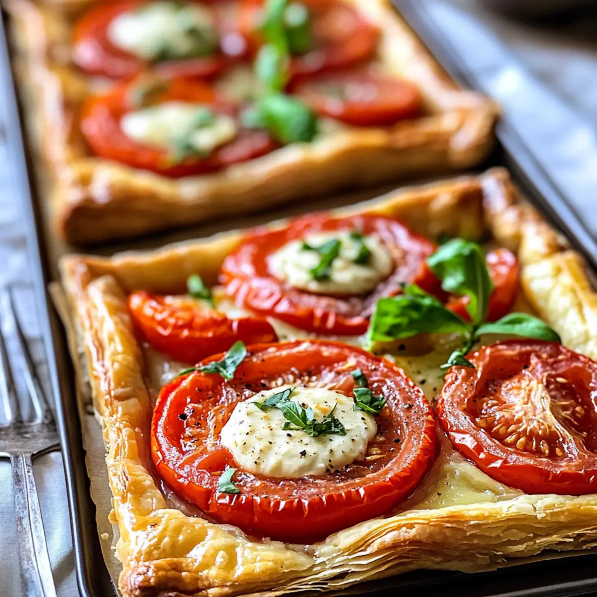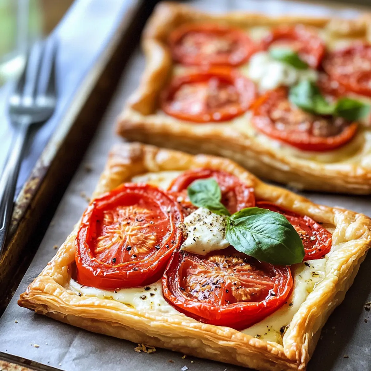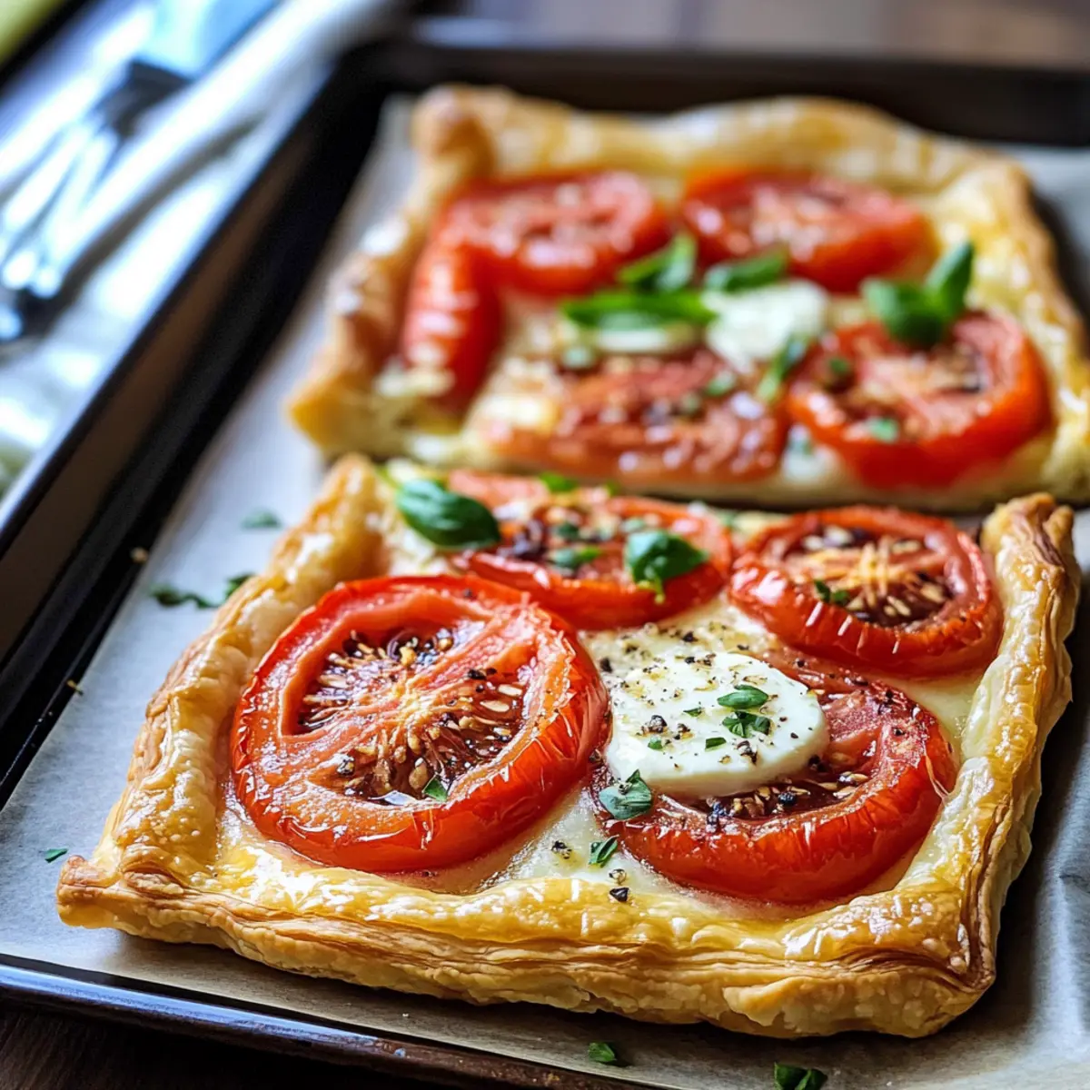 Köstliche Texturen: Der knusprige Blätterteig trifft auf zarte, süße Tomaten und cremigen Käse – ein Fest für die Sinne!