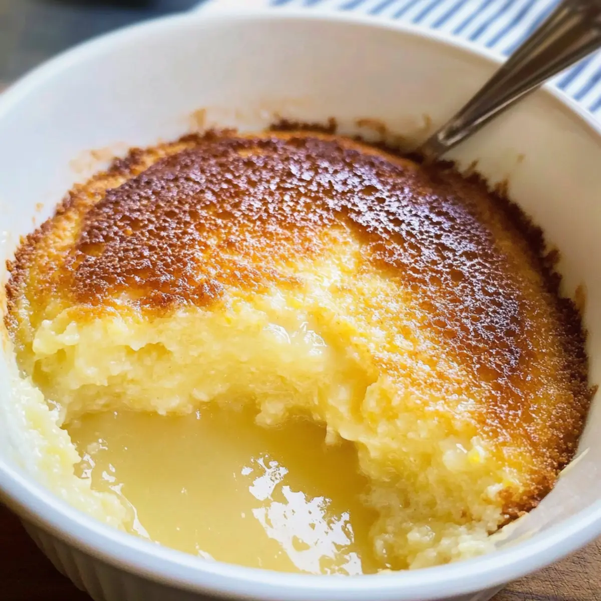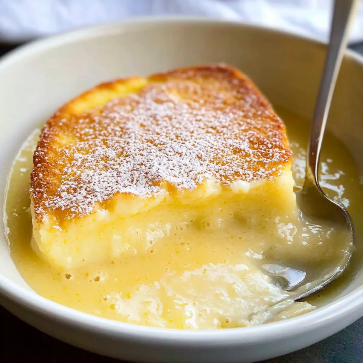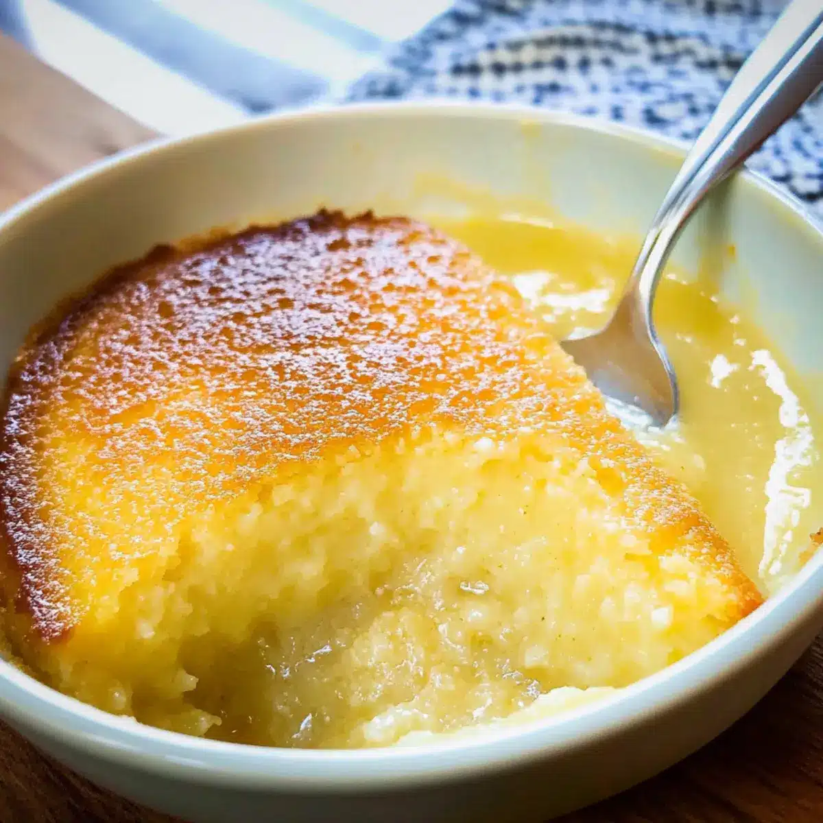 Auf die Wackelprobe achten: Der Zitronenpudding ist perfekt, wenn die Oberfläche goldbraun ist und in der Mitte leicht wackelt; das zeigt an, dass die Soße darunter noch schön cremig ist.