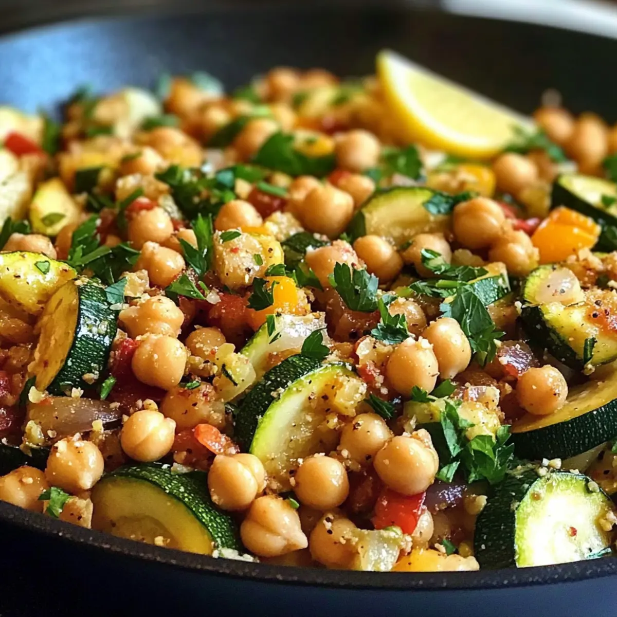 Nehme die Pfanne vom Herd und garniere das Gericht mit frischer Petersilie. Serviere die Zucchini und Kichererbsen Pfanne mit Zitronenschnitzen an der Seite, damit jeder nach Belieben einen Spritzer Zitrone hinzufügen kann. Diese finale Note bringt Frische und Tiefe, die das gesamte Gericht zum Strahlen bringt.